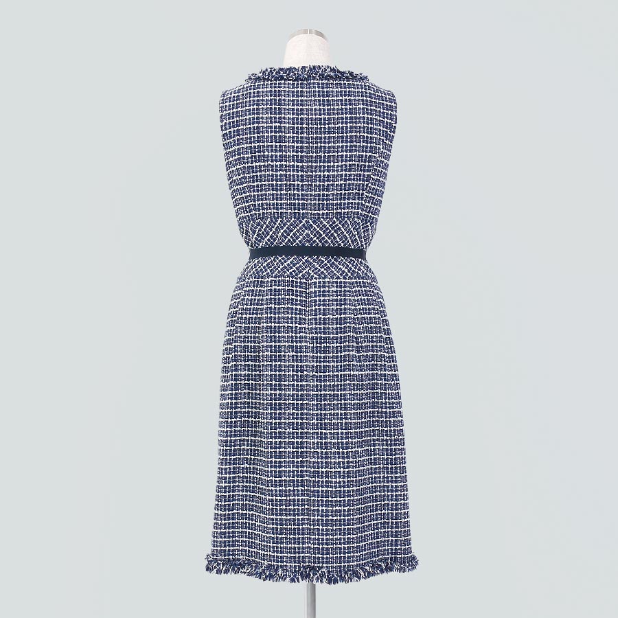 シックなネイビーのツイードドレス。