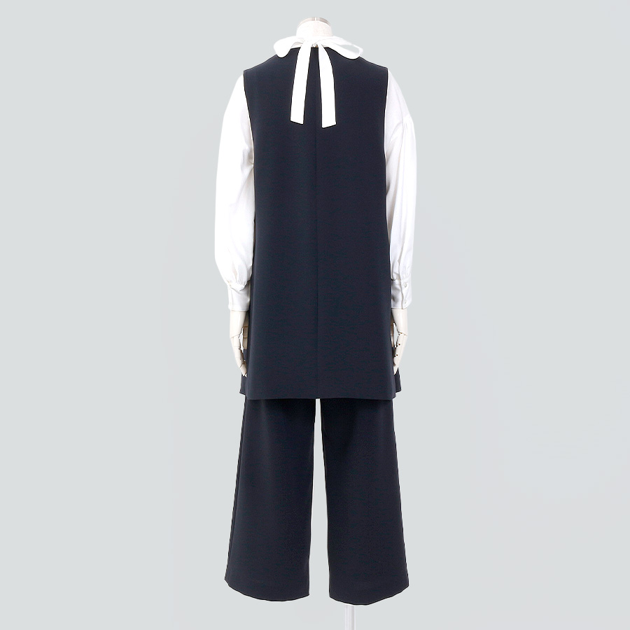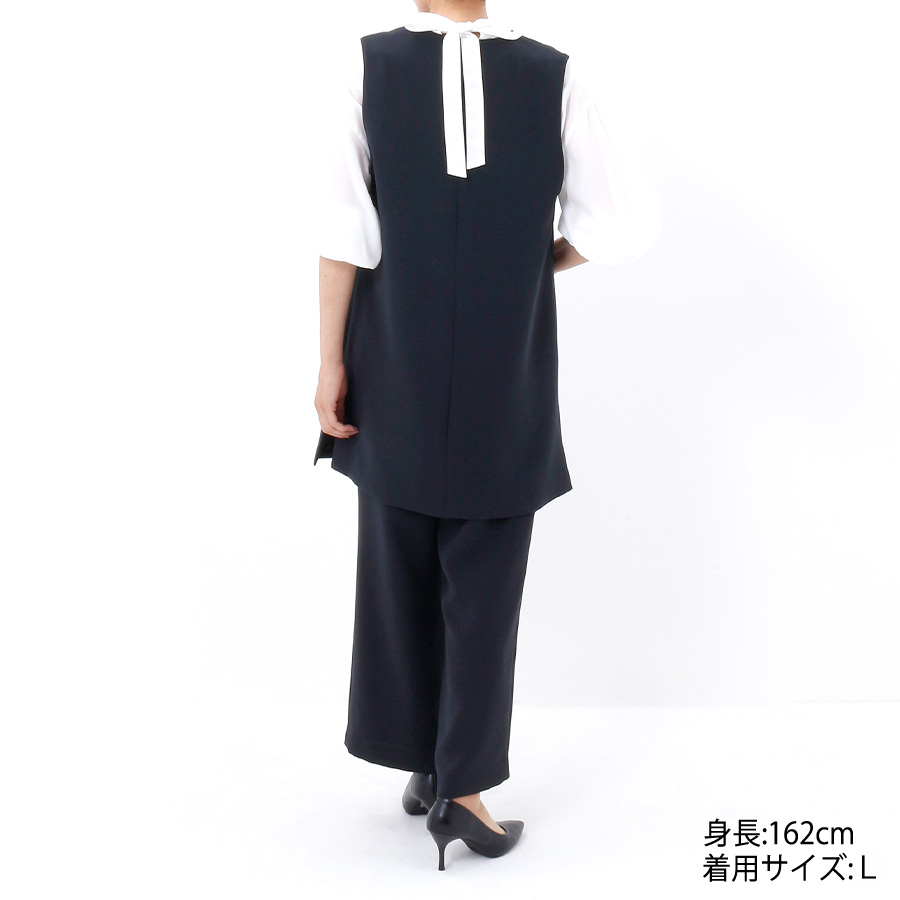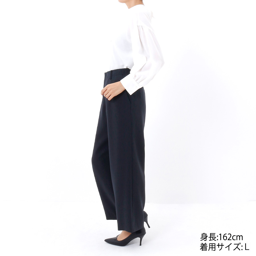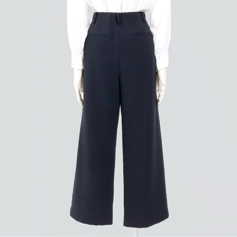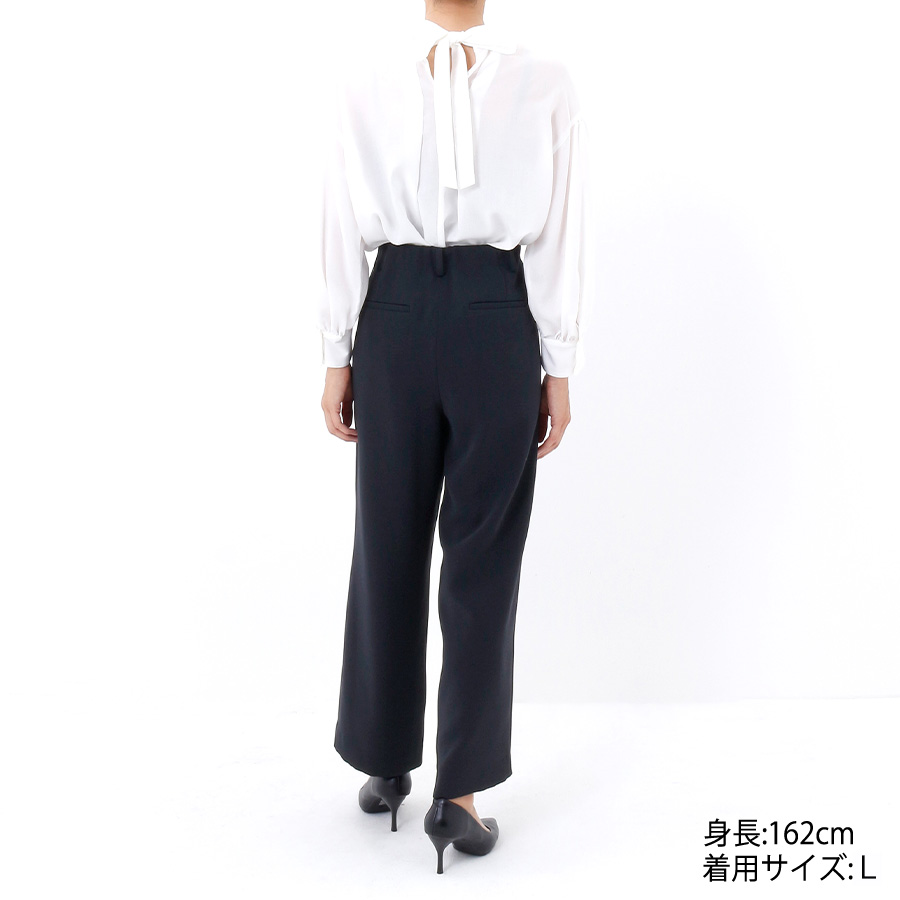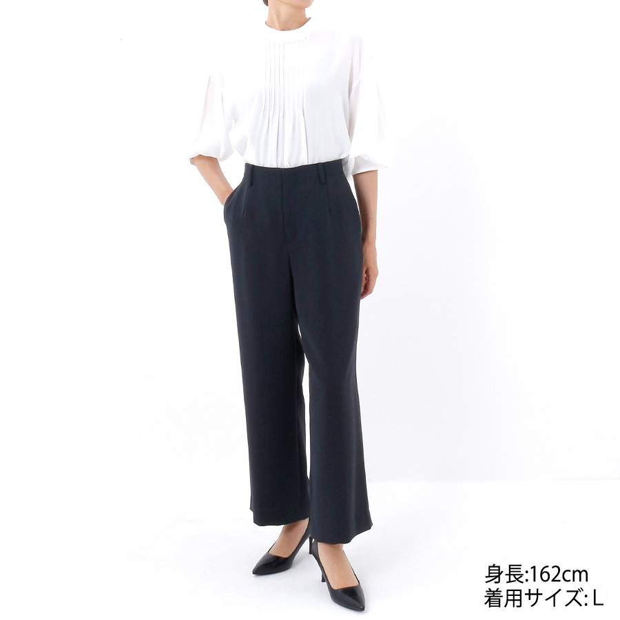 【パンツ】程よくゆとりのあるストレートシルエットのセミワイドパンツ。後ろはゴム仕様ですが表面からゴム部分が見えないためウエスト周りがすっきりとした印象。