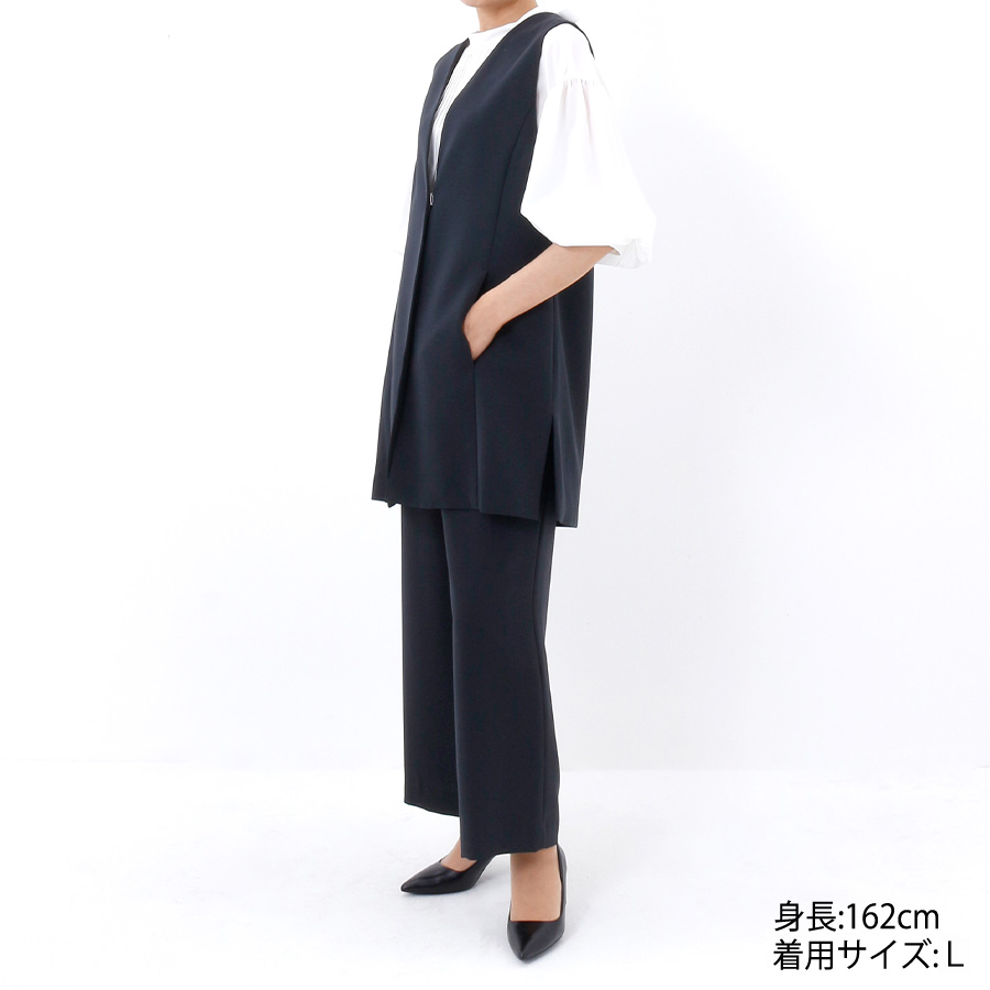 両サイドのスリットが動きやすく、長めの丈は気になる腰まわりを隠してくます。きちんと感のある着こなしはもちろん、カジュアルパンツとも相性が良く、単品使いもできるアイテム。通勤スタイルにもおすすめです。