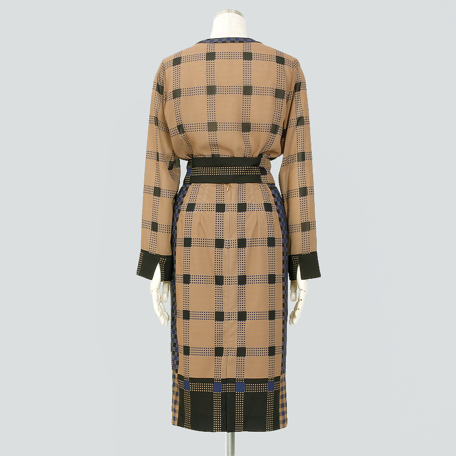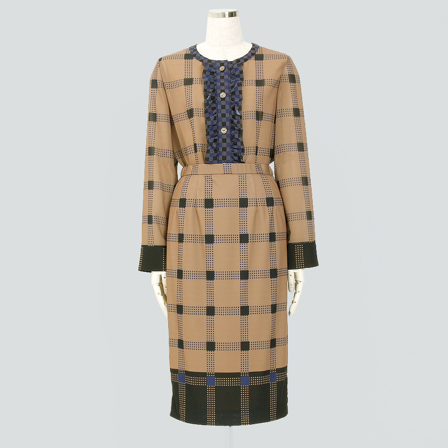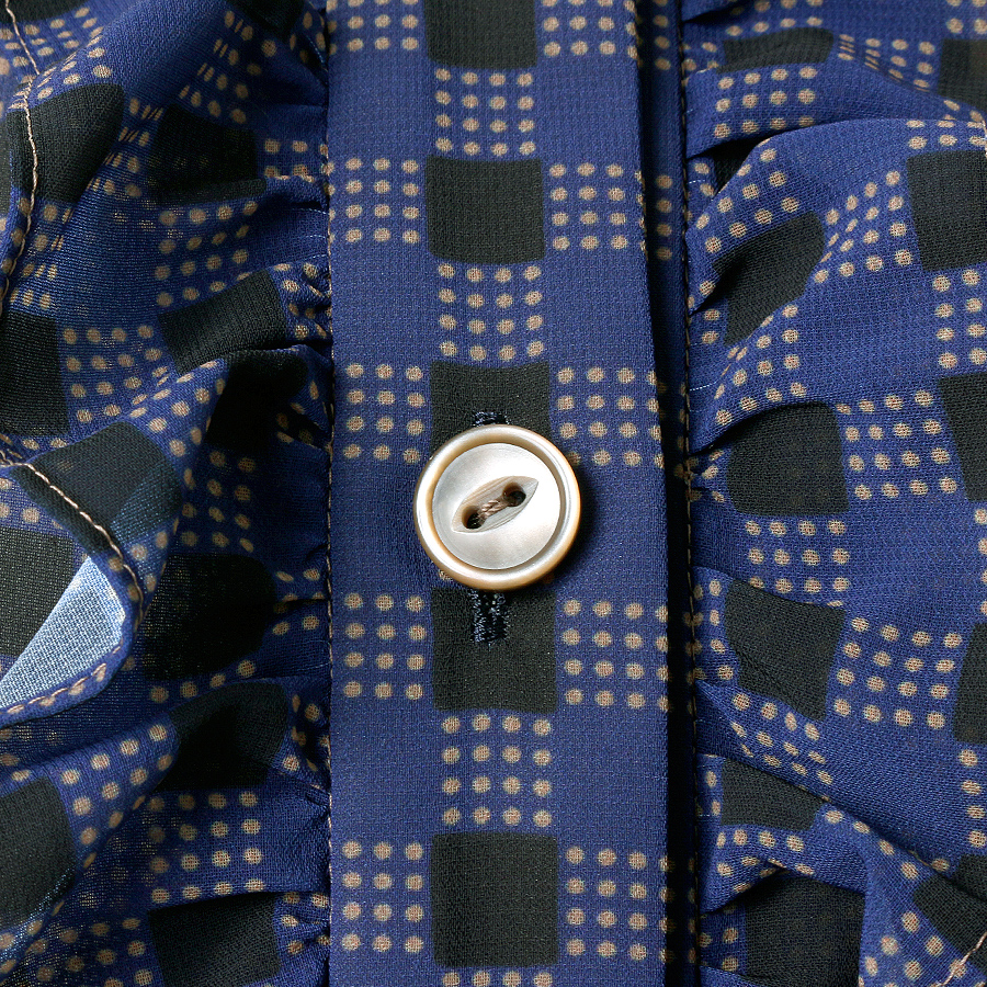 細やかなドットでチェック柄が表現されており、プリント違い、バイカラーのフリル付き前立てとのバランスが絶妙な、大人オシャレなセットアップです。