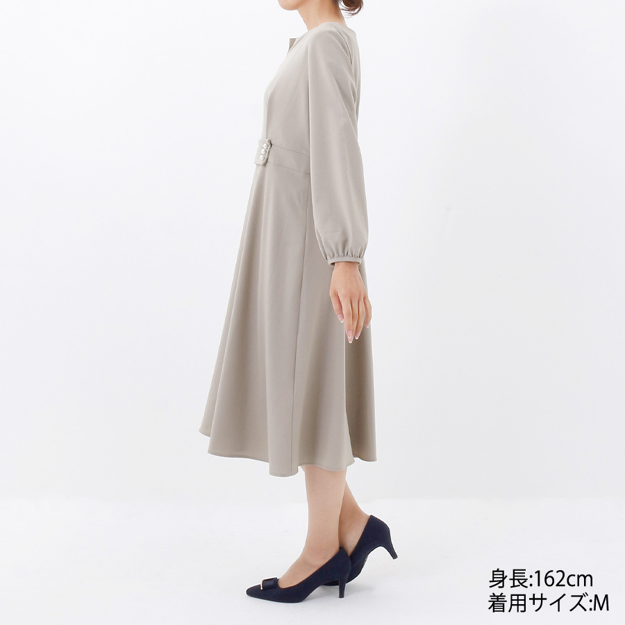 ウエスト部分のタックベルトに大きめのパールが3つ連なったデザインがポイントです。