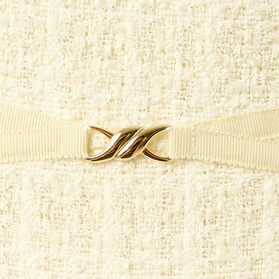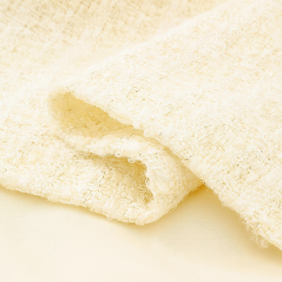 同じラメツイードのノーカラージャケットとセットで、3月下旬のパーティで着用しました。