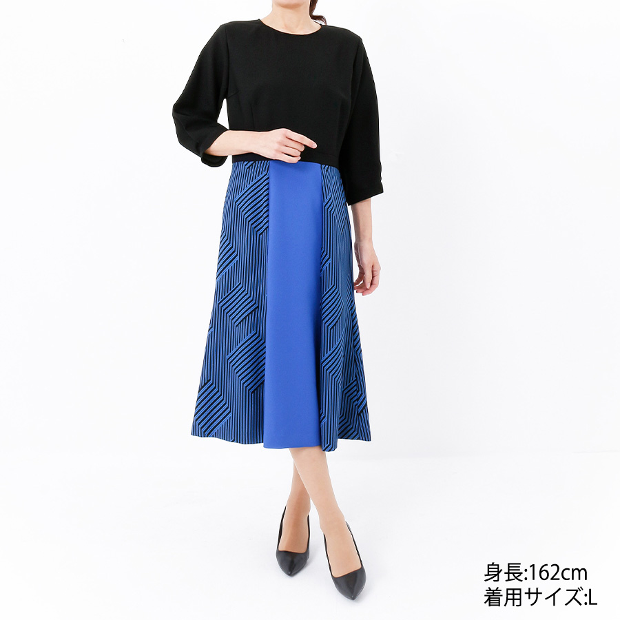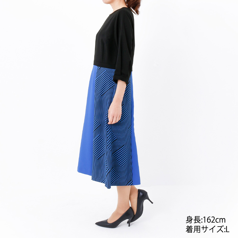 同素材の柄違い、色違いでドッキングされた程よいフレアシルエットのドッキングワンピース