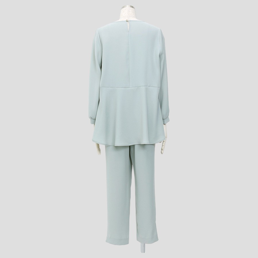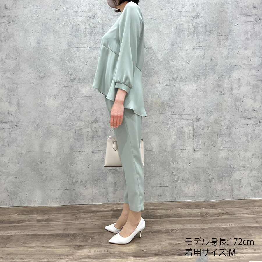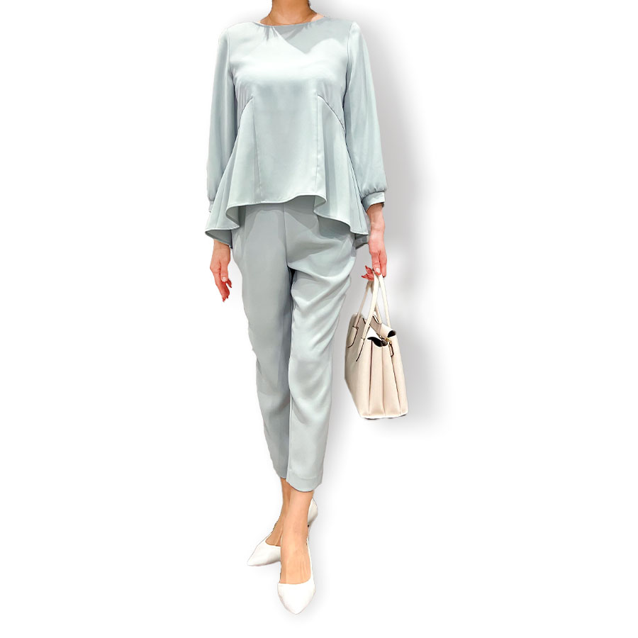 ブラウスは、さり気なくボディーラインのカバーもしてくれる華やかなペプラムデザイン。