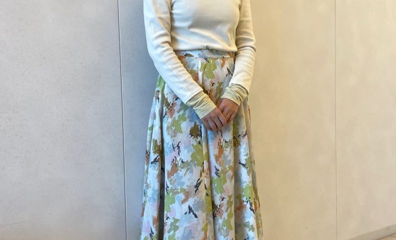 「買う」となったら、ここまでバッチリのコーデはしないかも…。袖や襟の色とスカートのカラーがバッチリ合っています。でも、落ち着いたカラーなので着やすい!こちらも大好評のコーデです♪