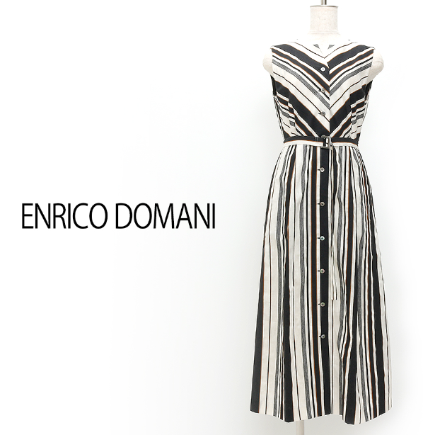ストライプ切替がスタイリッシュなノースリーブワンピース。Iラインに前後タックをあしらい、立体的な美シルエットが実現。キーネック仕立てで、首回りがすっきり見えるのもポイントです。共布リボンベルトでウエストをマークすればスタイルアップも◎ 綿麻混のさらりとした手触りで、夏のお出掛けにピッタリな一着です。