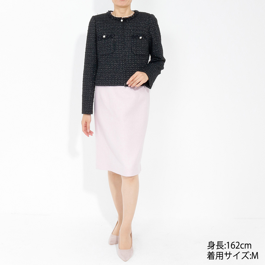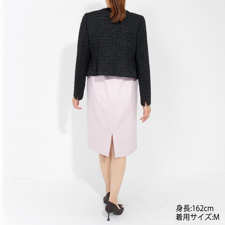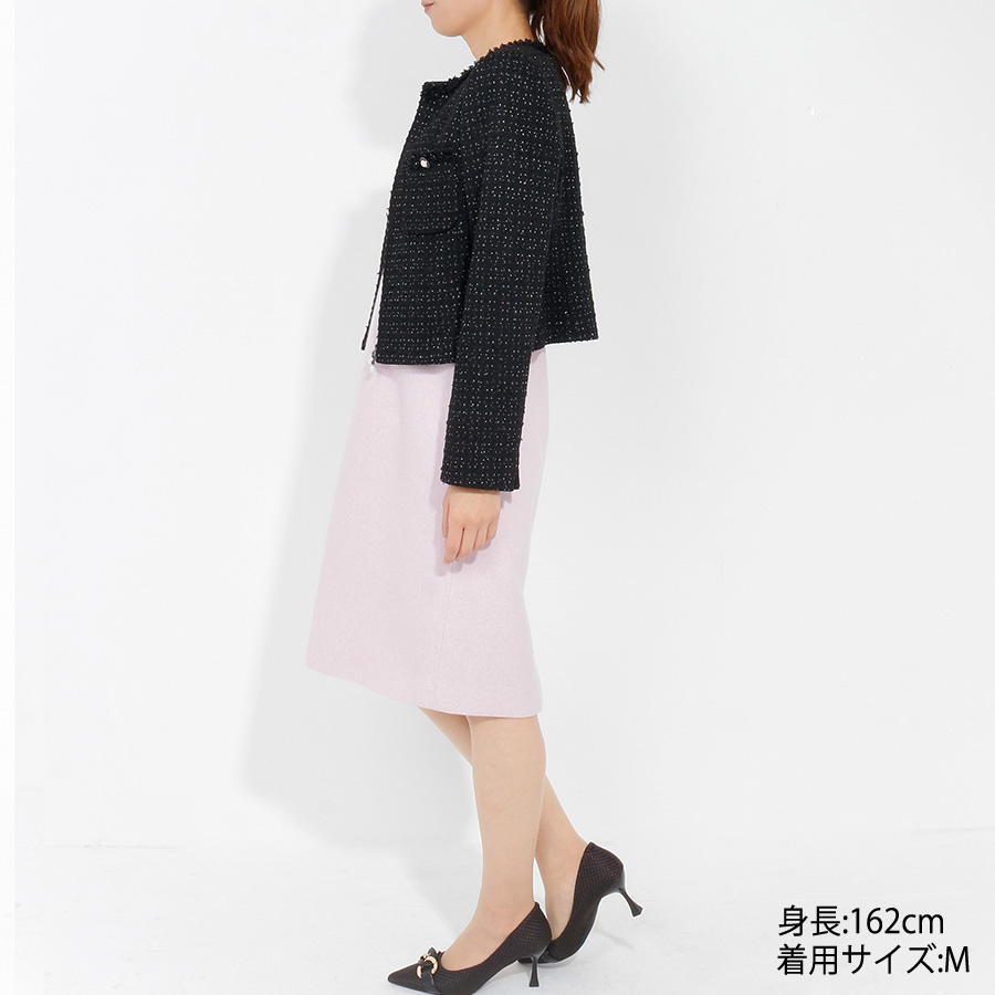 上品なラメツイード素材が魅力のノーカラージャケット。