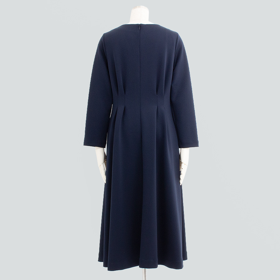 ウエストにタックを施し、自然に広がるフレアシルエットで女性らしさを演出します。