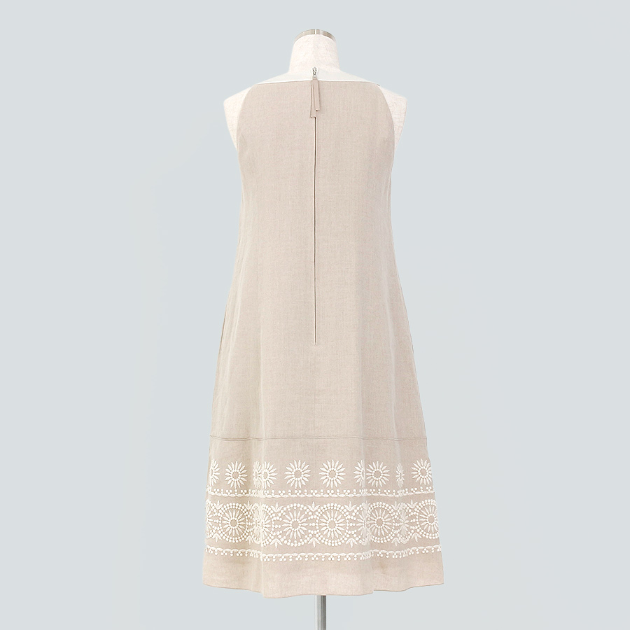 リネン素材で涼しげなワンピースは、繊細な刺繍がアクセントになっています。