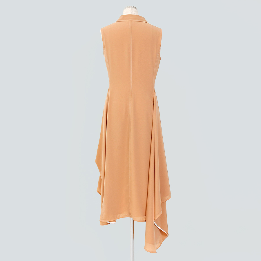 ★スタッフコメント★シャープなVネックがモダンな印象のワンピース。程よい落ち感とアプリコットカラーが肌を美しく見せ、スタイルをより美しく見せてくれます。アシンメトリーの裾が動くたびにふんわりと揺れるエレガントなシルエット。おでかけやカジュアルなデートで活躍する一枚です。