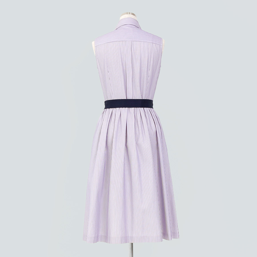 ★スタッフコメント★細やかなピンストライプが上品さを際立たせるノースリーブシャツワンピース。程よいハリ感とさらっとしたやさしい肌ざわりのコットン素材。ウエストのベルトが女性らしいシルエットを美しく演出します。日常使いからオフィスまで、幅広いシーンで活躍すること間違いなしのアイテムです。※裏地のないワンピースですので、濃色のインナーをご着用の際はご注意ください。