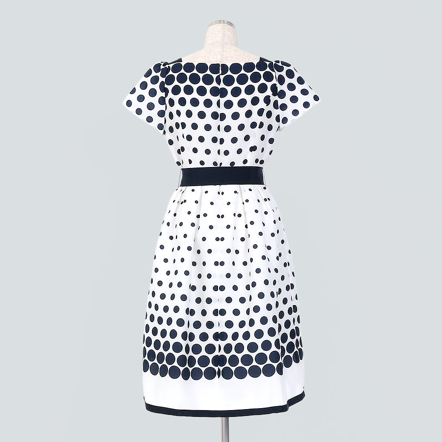 ★スタッフコメント★ランダムなサイズのドットが目を引くワンピース。適度なハリと控え目な光沢感のあるツイル素材。フィット&フレアのシルエットがエレガントな動きを演出します。おでかけやデート、女子会などにお勧めです。