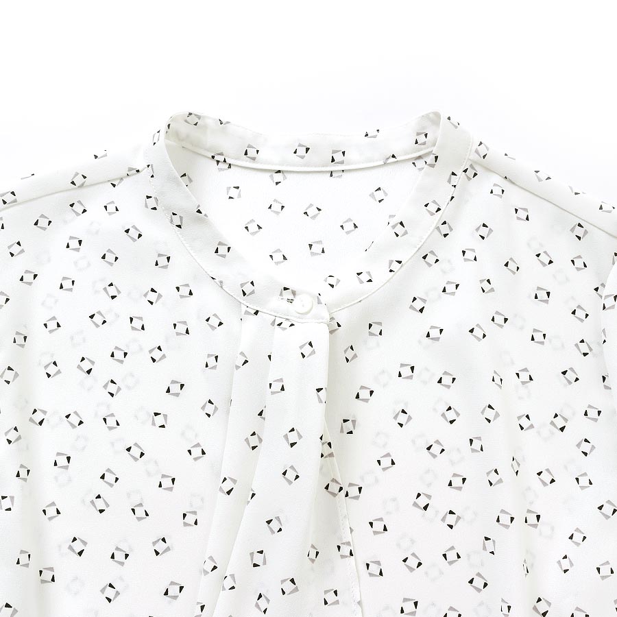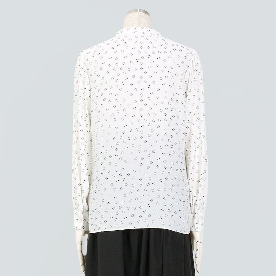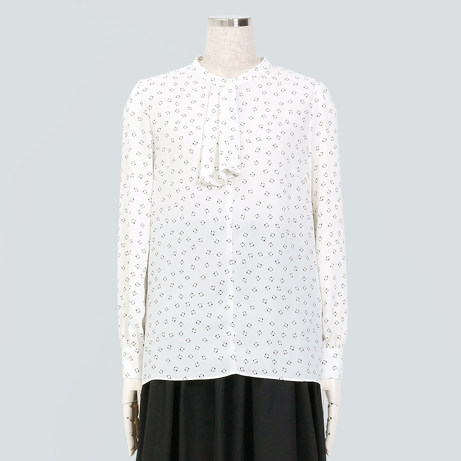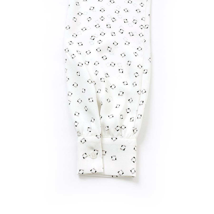 遊び心あるスモールジオメトリックプリントが目を引くボウタイ風デザインのブラウス。