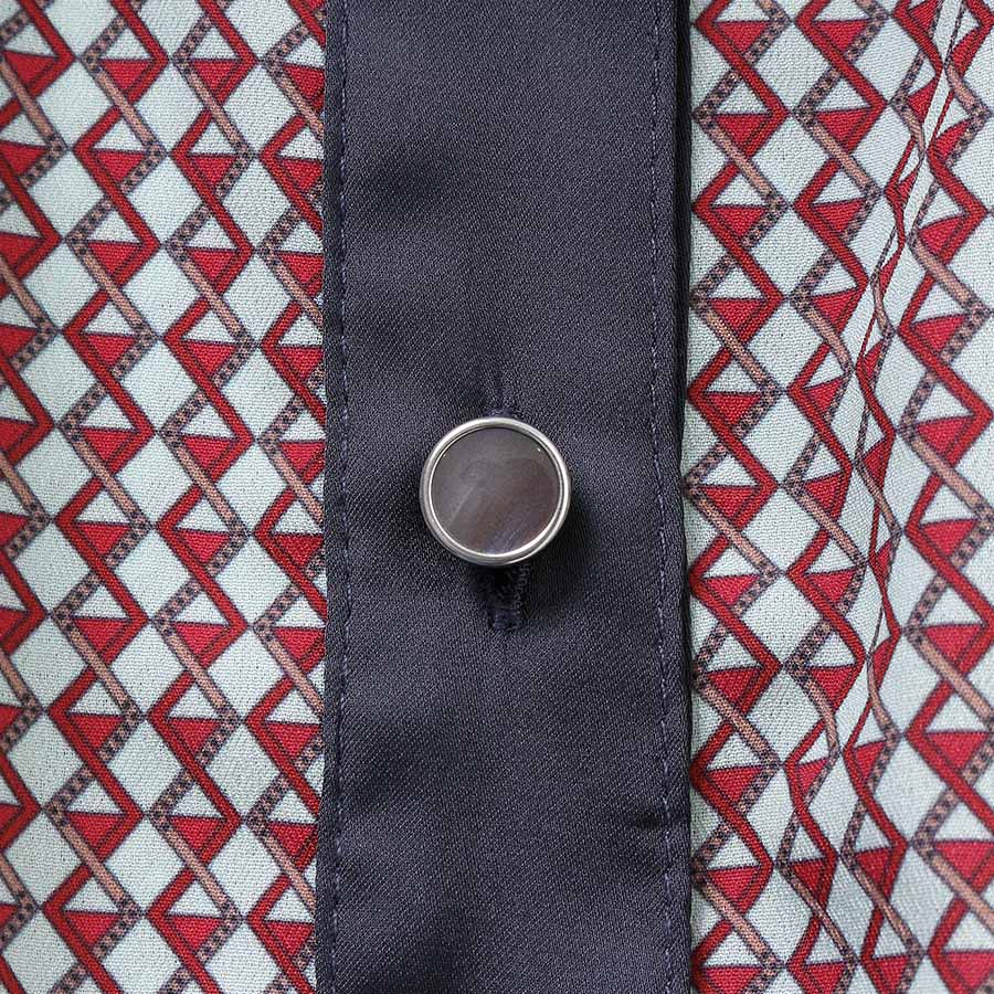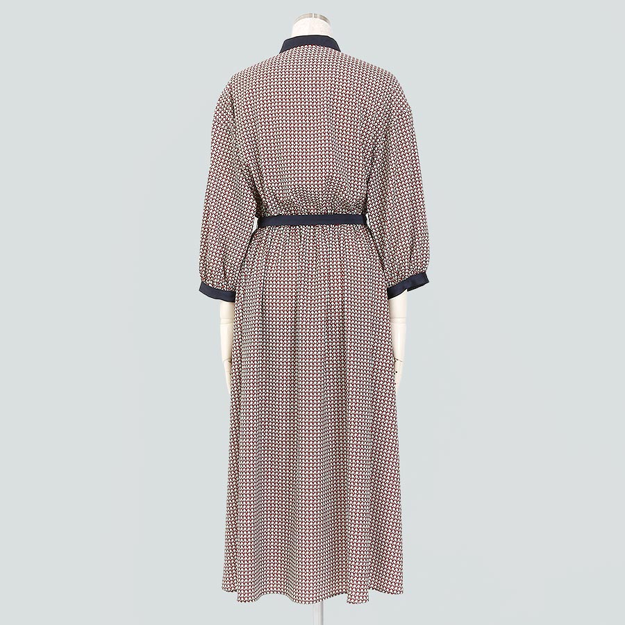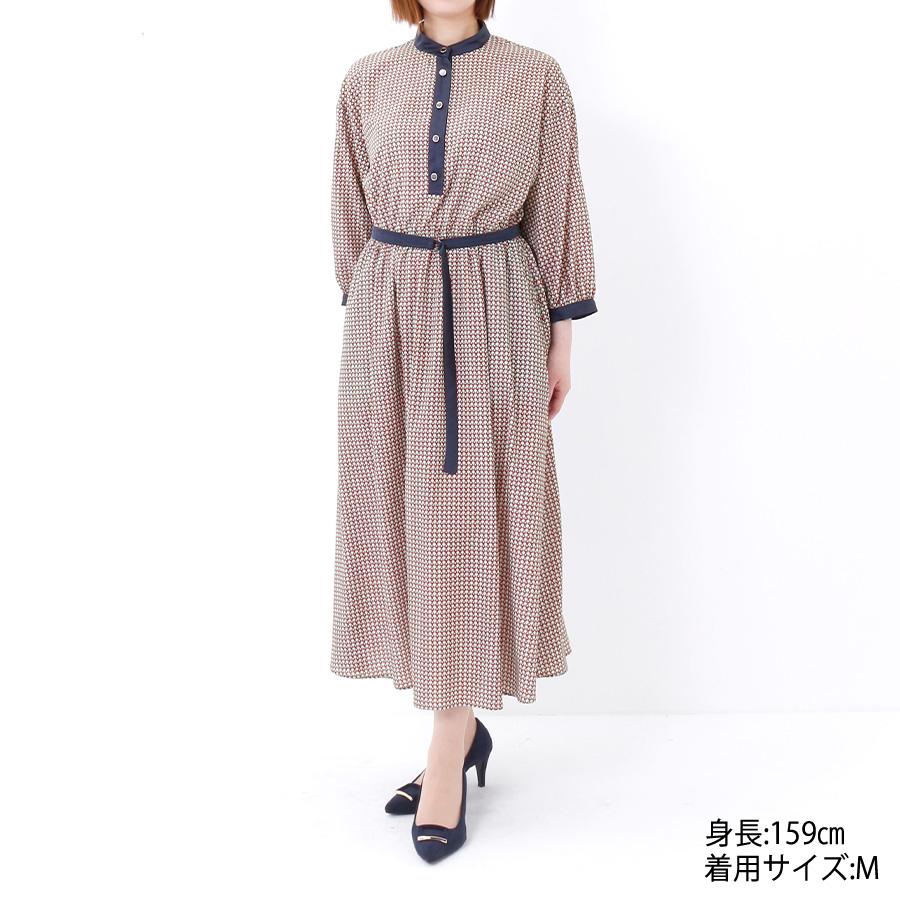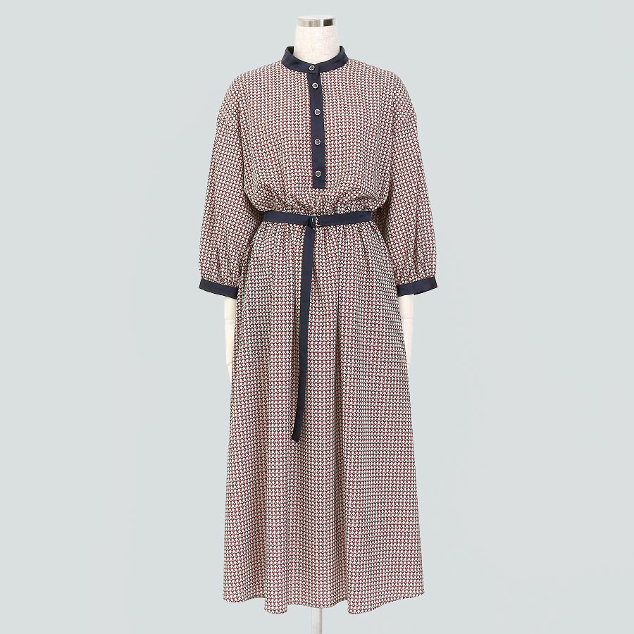 ジオメトリックなパターンと配色のパイピングでコントラストを効かせたワンピース。