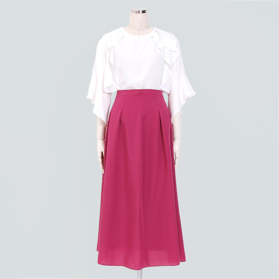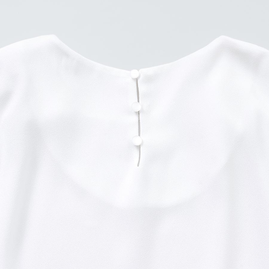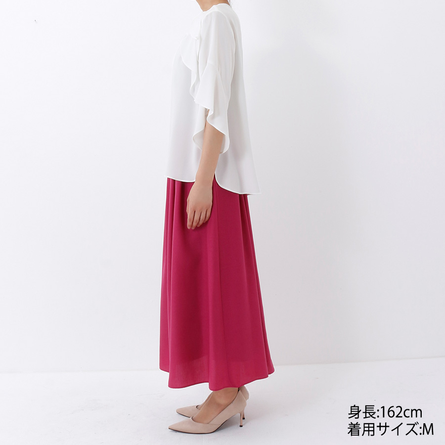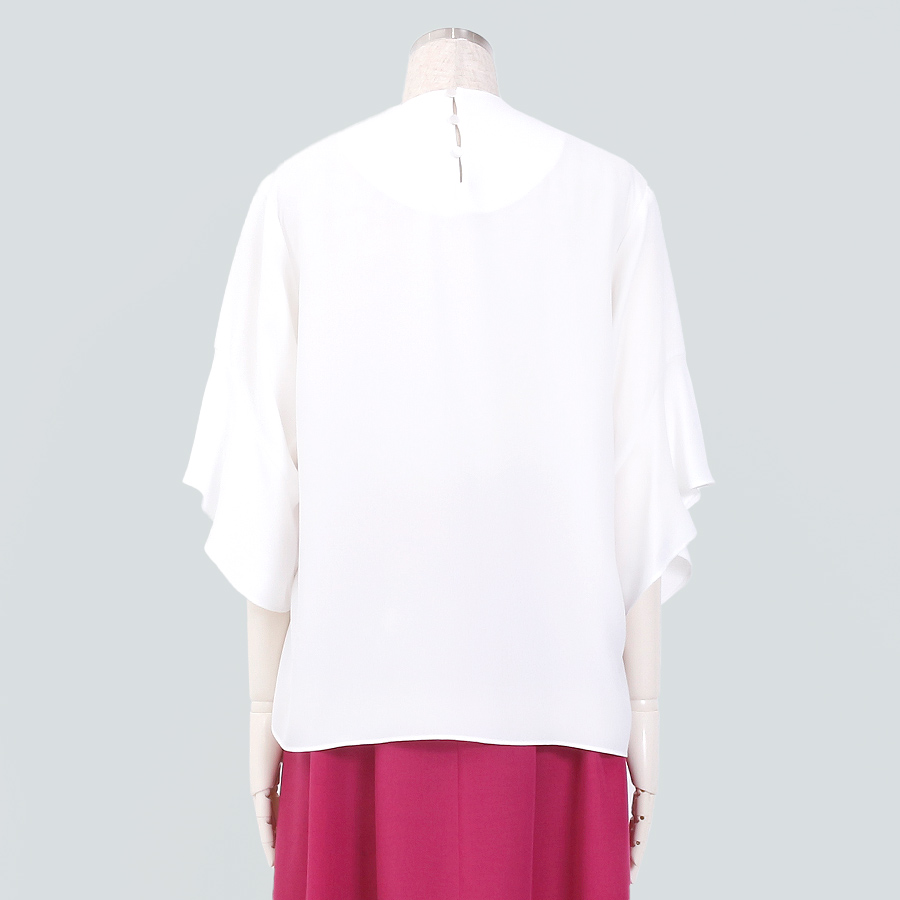 肩口を覆うようなフリルでほんのり甘くアレンジされたブラウス。