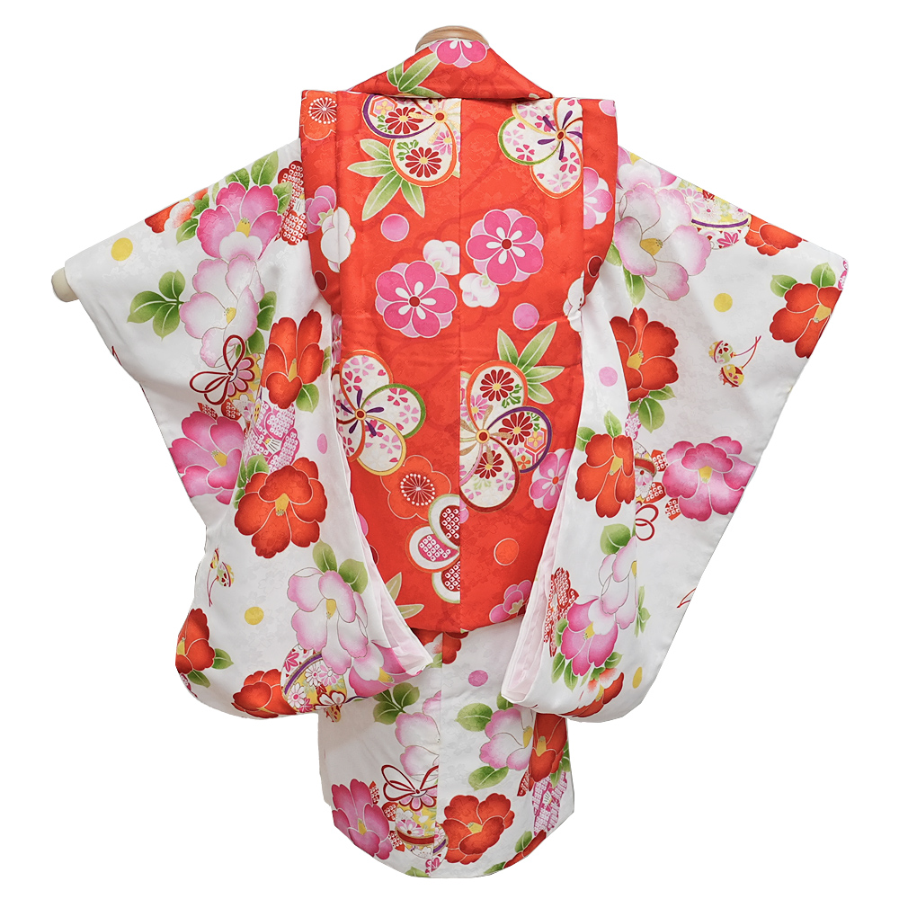 セット内容:着物・重ね衿(縫付済)・襦袢・半襟(縫付済)・被布コート・被布飾り(縫付済)・腰紐2本・髪飾り・巾着・草履・足袋15-16cm(プレゼント)