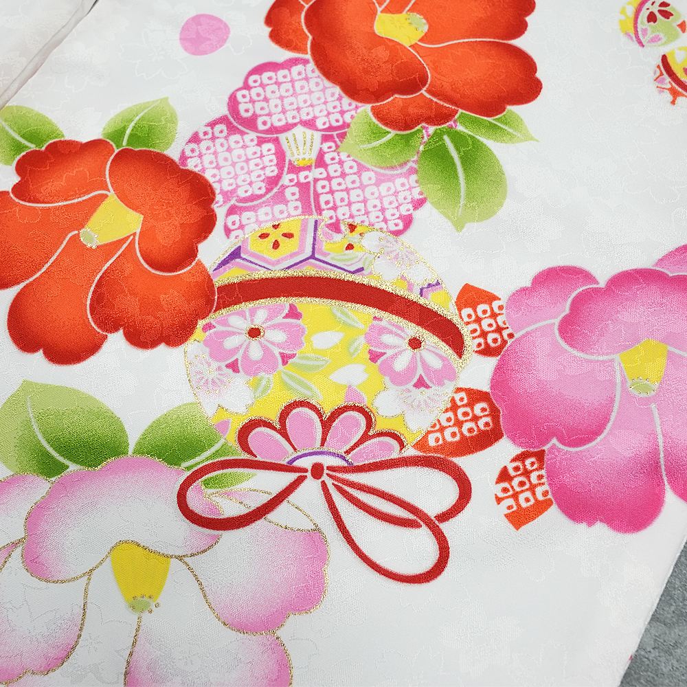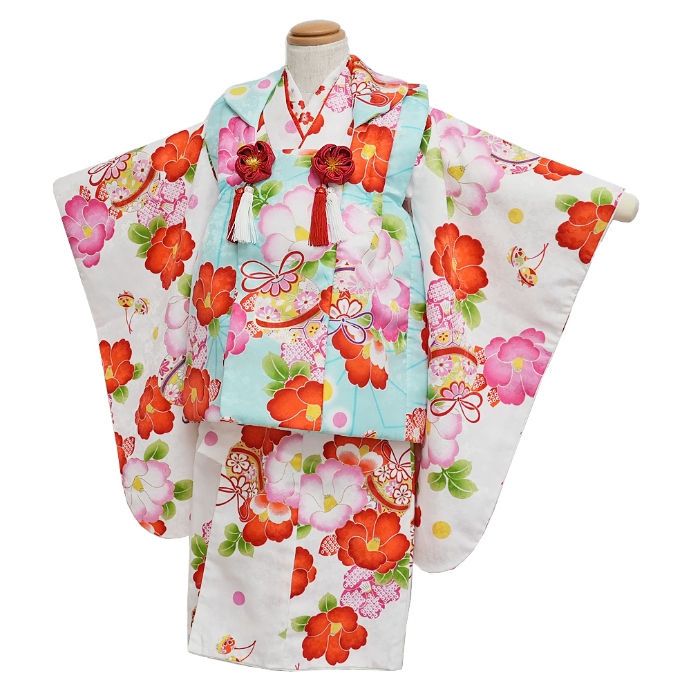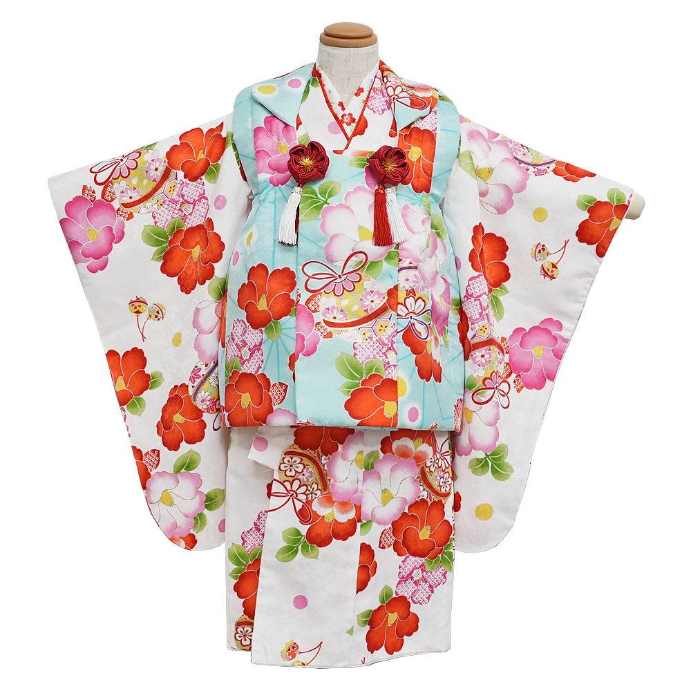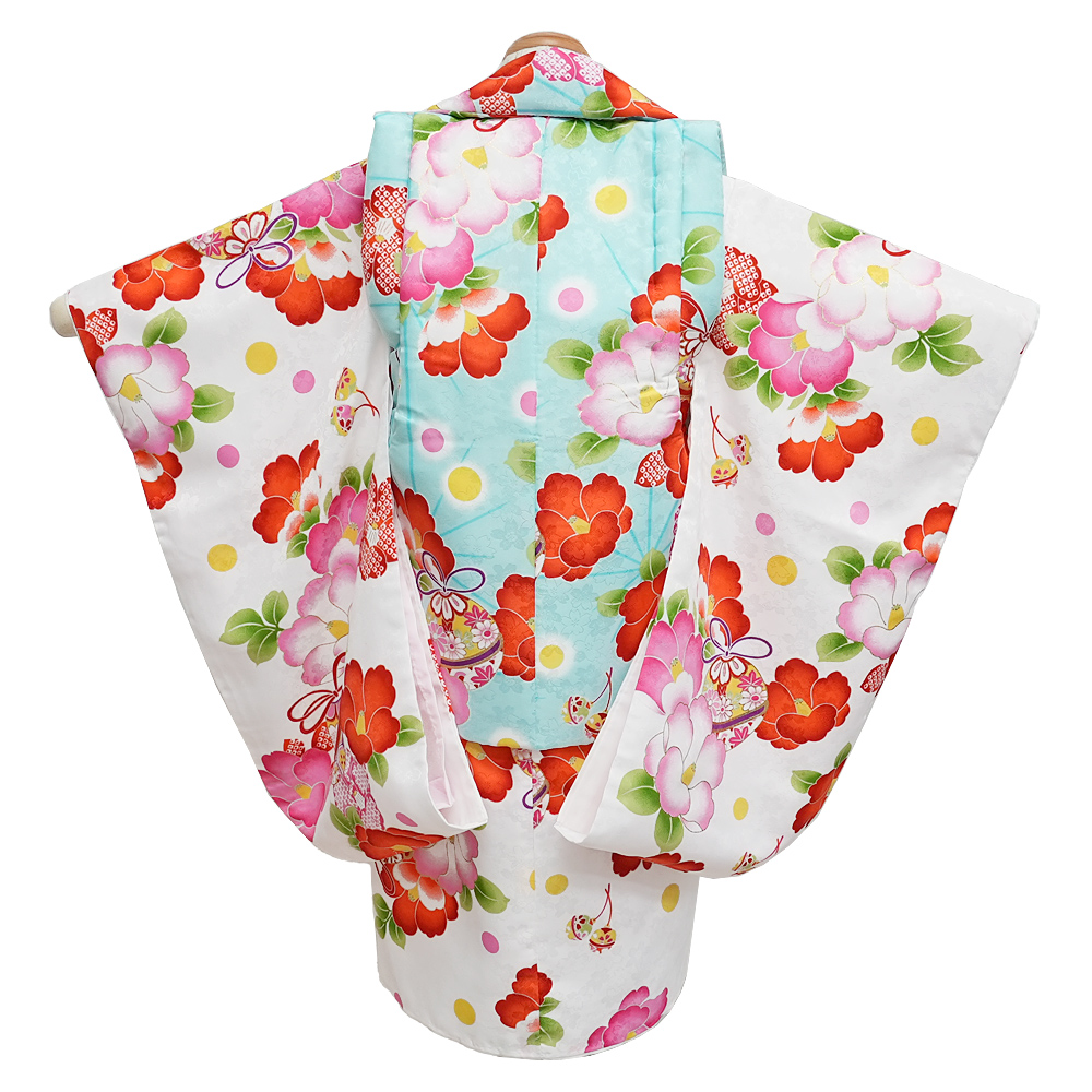 セット内容:着物・重ね衿(縫付済)・襦袢・半襟(縫付済)・被布コート・被布飾り(縫付済)・腰紐2・本髪飾り・巾着・草履・足袋15-16cm(プレゼント)