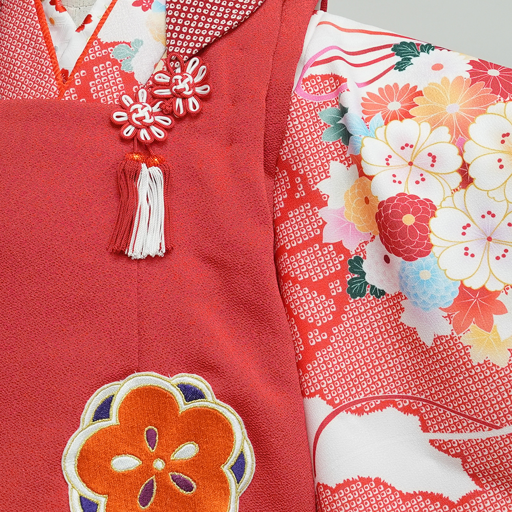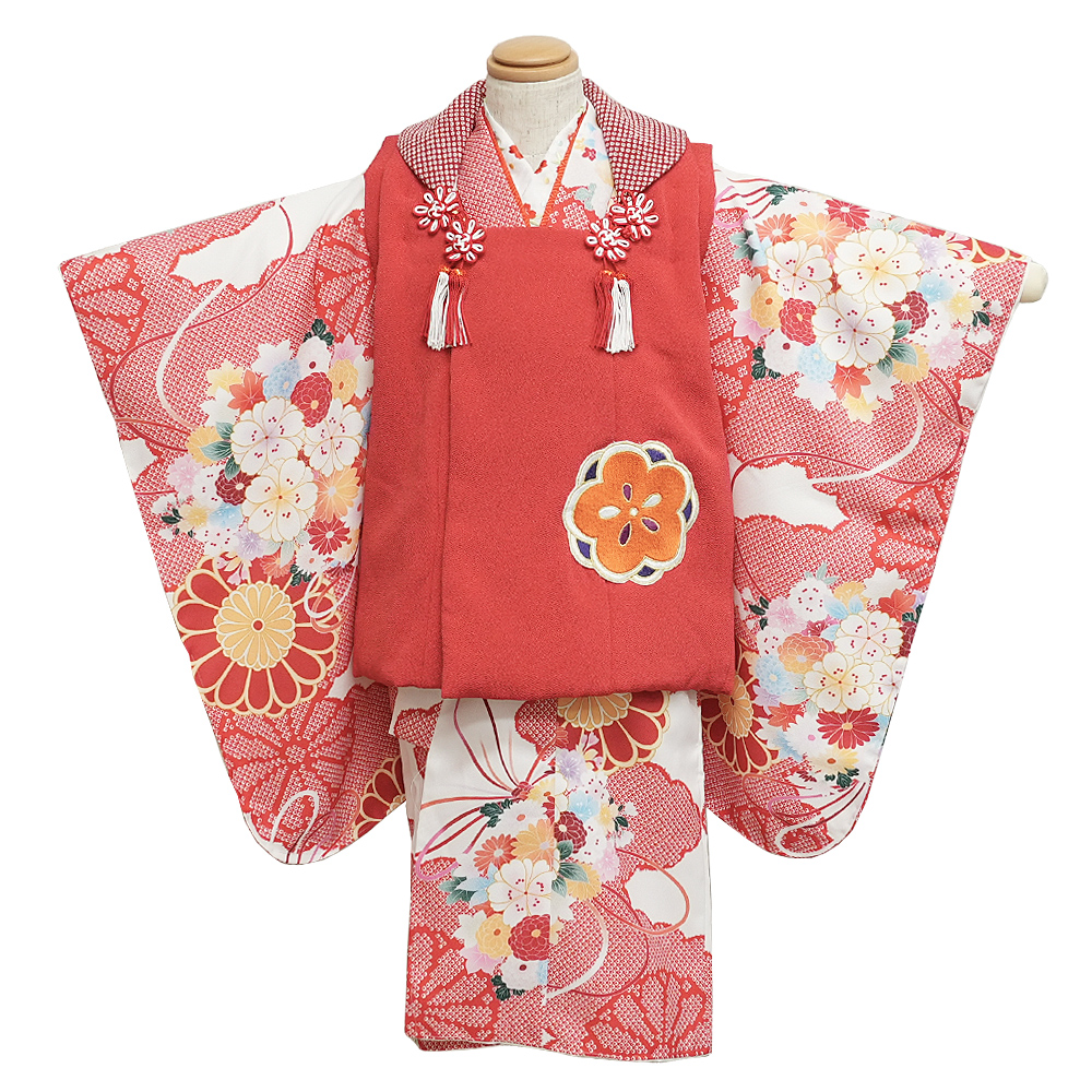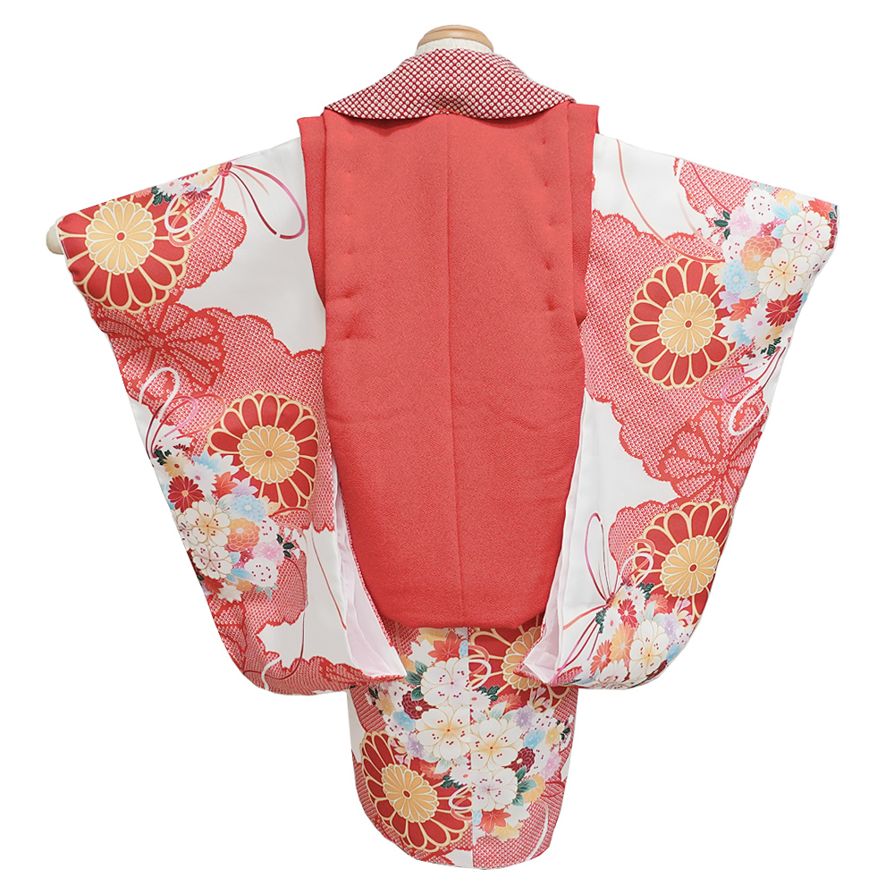 セット内容:着物・重ね衿(縫付済)・襦袢・半襟(縫付済)・被布コート・被布飾り(縫付済)・腰紐2本・髪飾り・巾着・草履・足袋15-16cm(プレゼント)