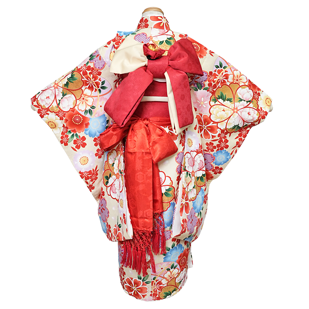 四つ身着物、重ね衿(縫付済み)、襦袢、半襟(縫付済)作り帯、髪飾り、帯揚げ風帯板、帯締め、しごき、末広(扇子)、ハコセコ、バッグ、足袋17-18cm、草履、腰紐2本、和装ベルト、伊達締め