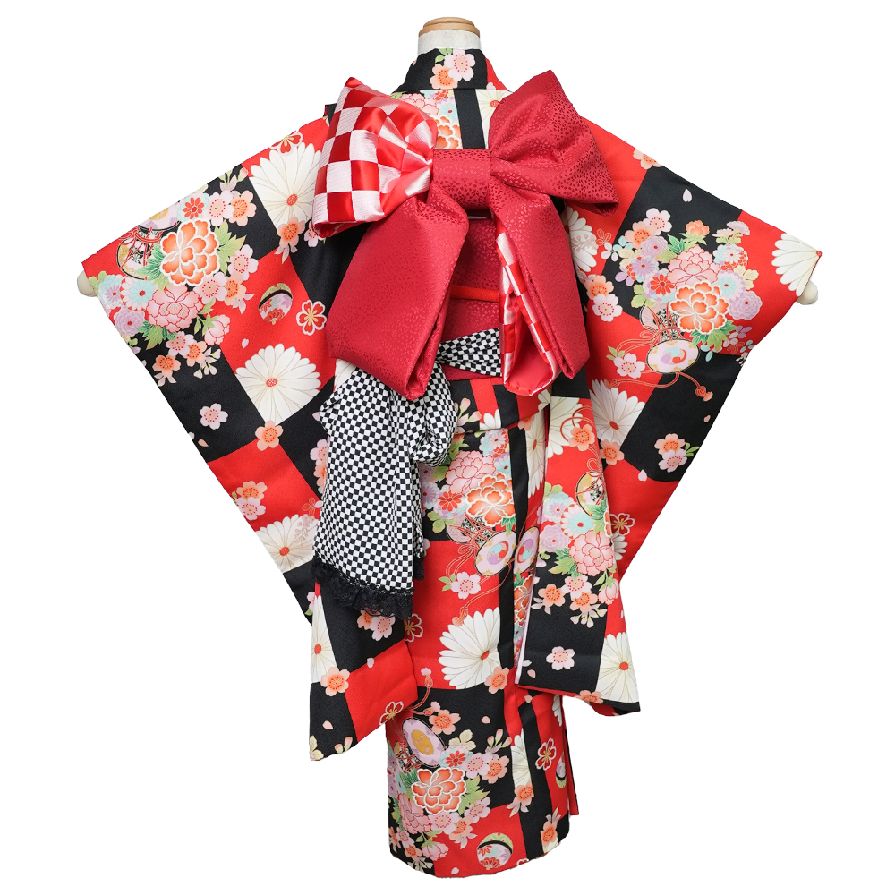 【初回レンタル】七五三 着物 7歳 フルセット 市松 赤 黒(Fサイズ / ブラック / 京都瑠璃雛菊(キョウトルリヒナギク)) [17点セット]