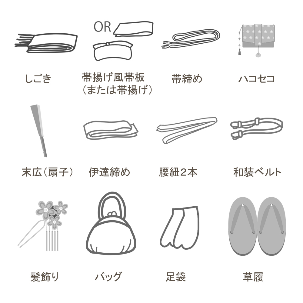 四つ身着物、重ね衿(縫付済み)、襦袢、半襟(縫付済)作り帯、髪飾り、帯揚げ風帯板、帯締め、しごき、末広(扇子)、ハコセコ、バッグ、足袋19-20cm、草履、腰紐2本、和装ベルト、伊達締め