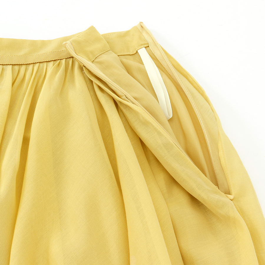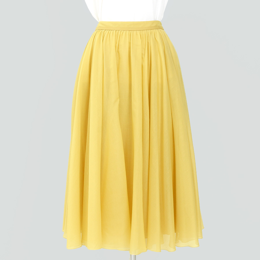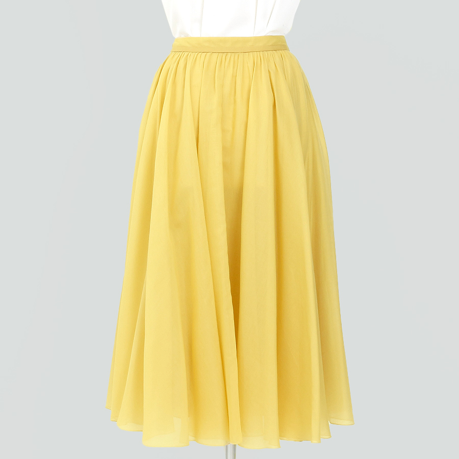 ★スタッフコメント★明るいイエローが目を引くこのスカート。 シルク混で軽やかな着心地を実現します。 エレガントな流れるようなシルエットは、カジュアルからフォーマルまで幅広いシーンに最適です。 ブラウスや薄手のニットと合わせることで、季節感のあるスタイルに仕上がります。 シンプルなアクセサリーで上品さをプラスして、特別なお出かけの日にもぴったりです。
