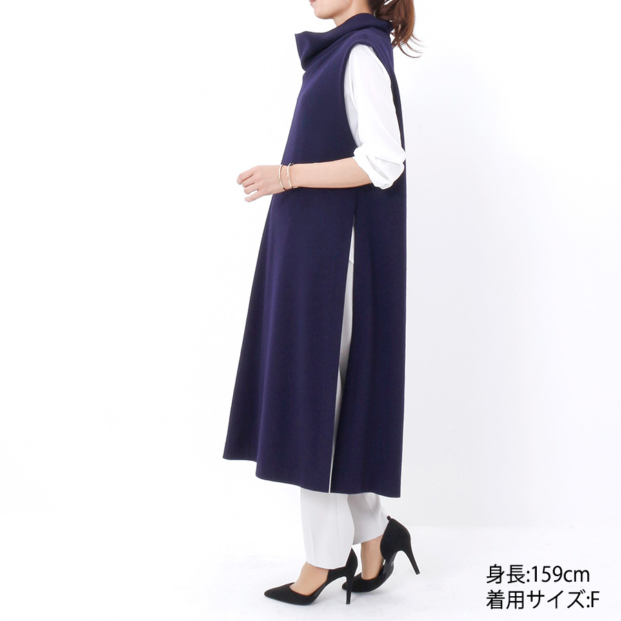 ベストやジレのようにパンツやスカート、ワンピース等の上からご着用いただくタイプのオーバーワンピース。暖かなウール100%素材で、首元のたっぷりとした生地使いとサイドの深いスリットが360度どこから見てもサマになるデザイン。コーディネイトの幅も広がります。