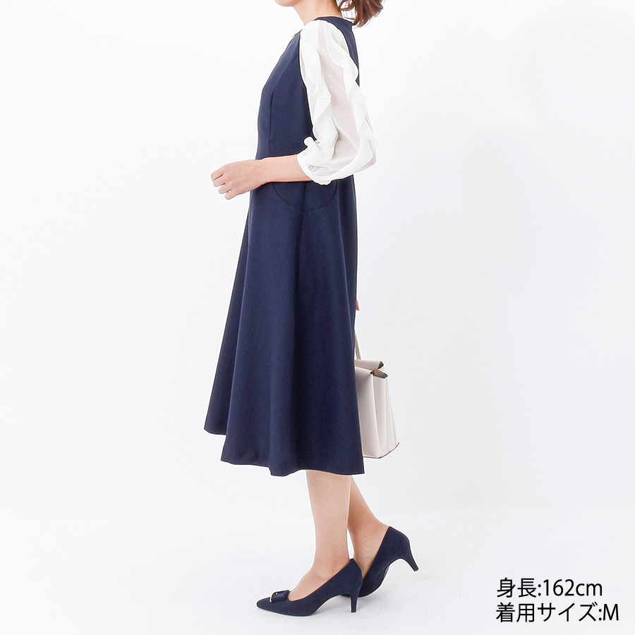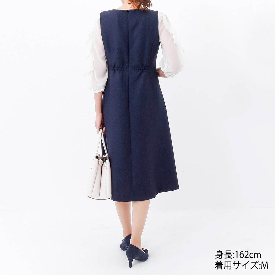 袖をシフォンで切替えた1枚でレイヤードスタイルが完成する袖付きワンピース。