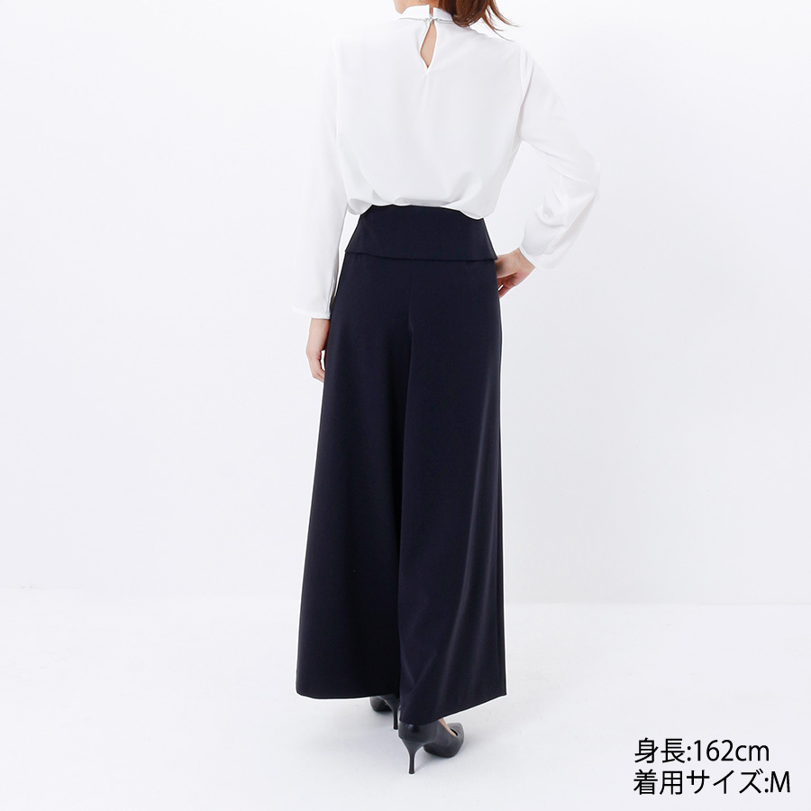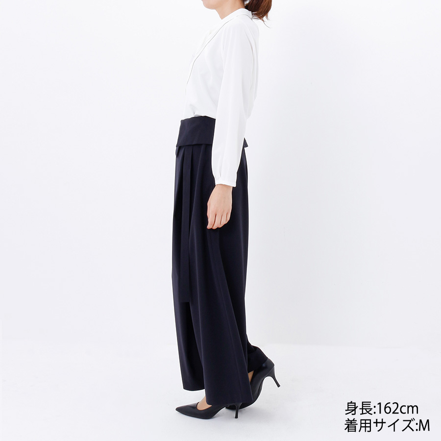 ウエスト部分の折り返しが印象的なラップワイドパンツ。