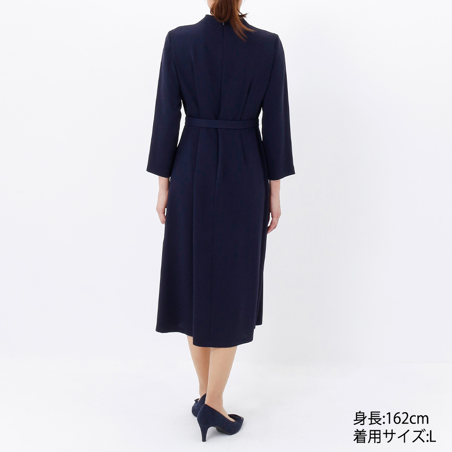 衿のアシメドレープが女性らしい雰囲気のワンピース。