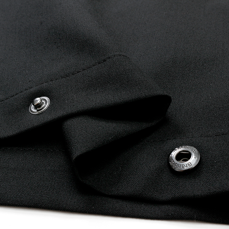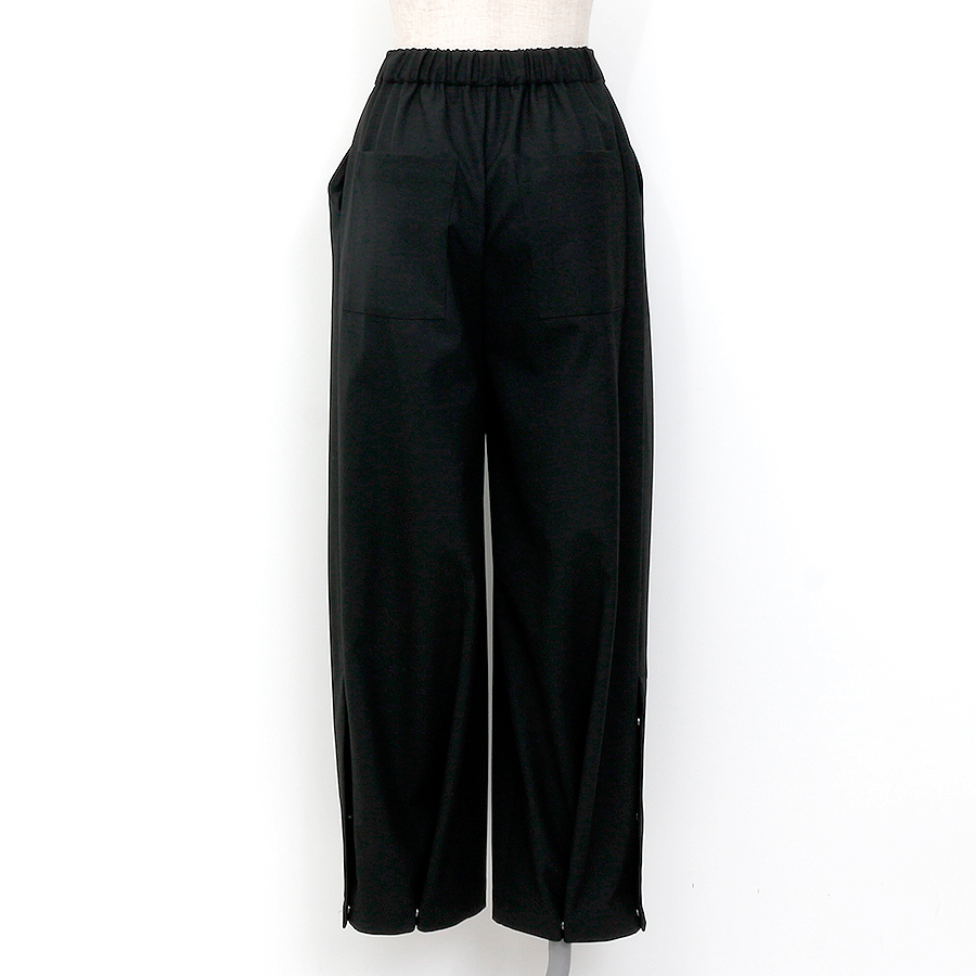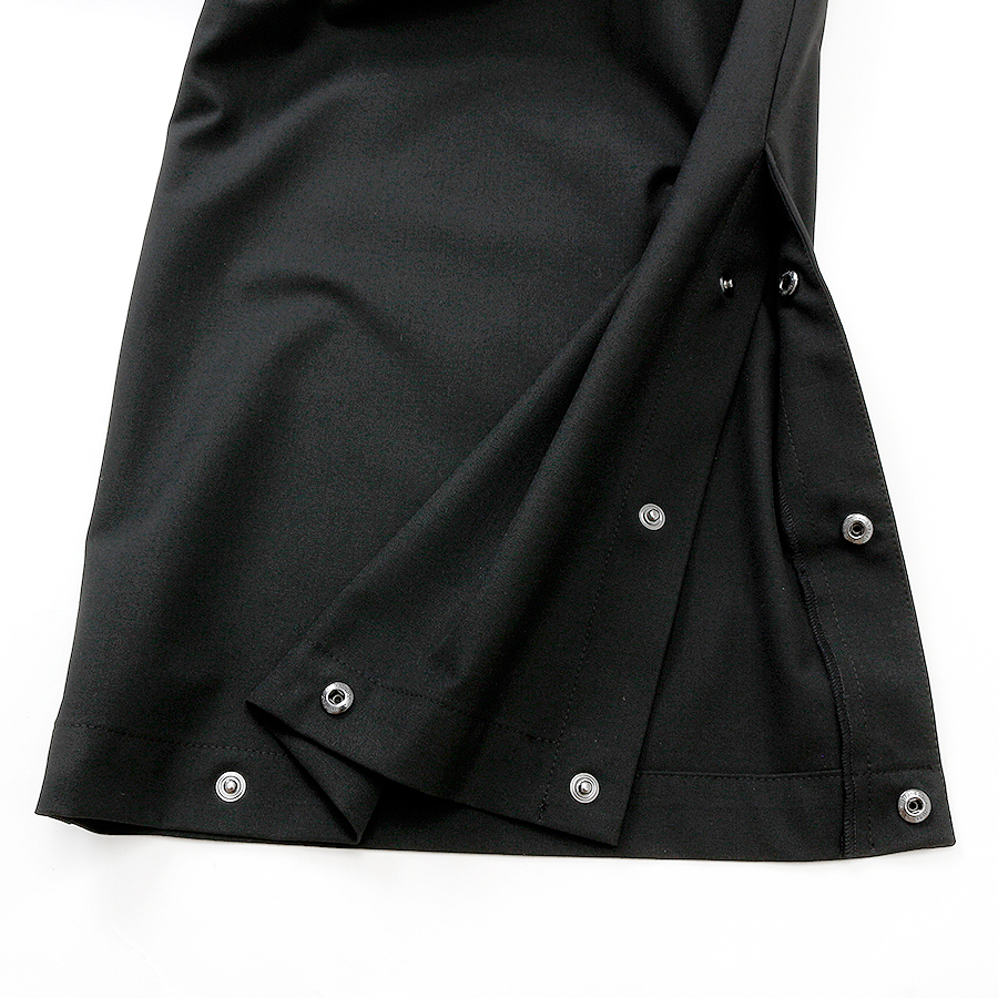 サイドにはドット釦で開け閉め可能なスリット明きを、後ろ裾には裾周りを小さくするドット釦が付いておりスタイリングに合わせて変化をつけて頂けます。