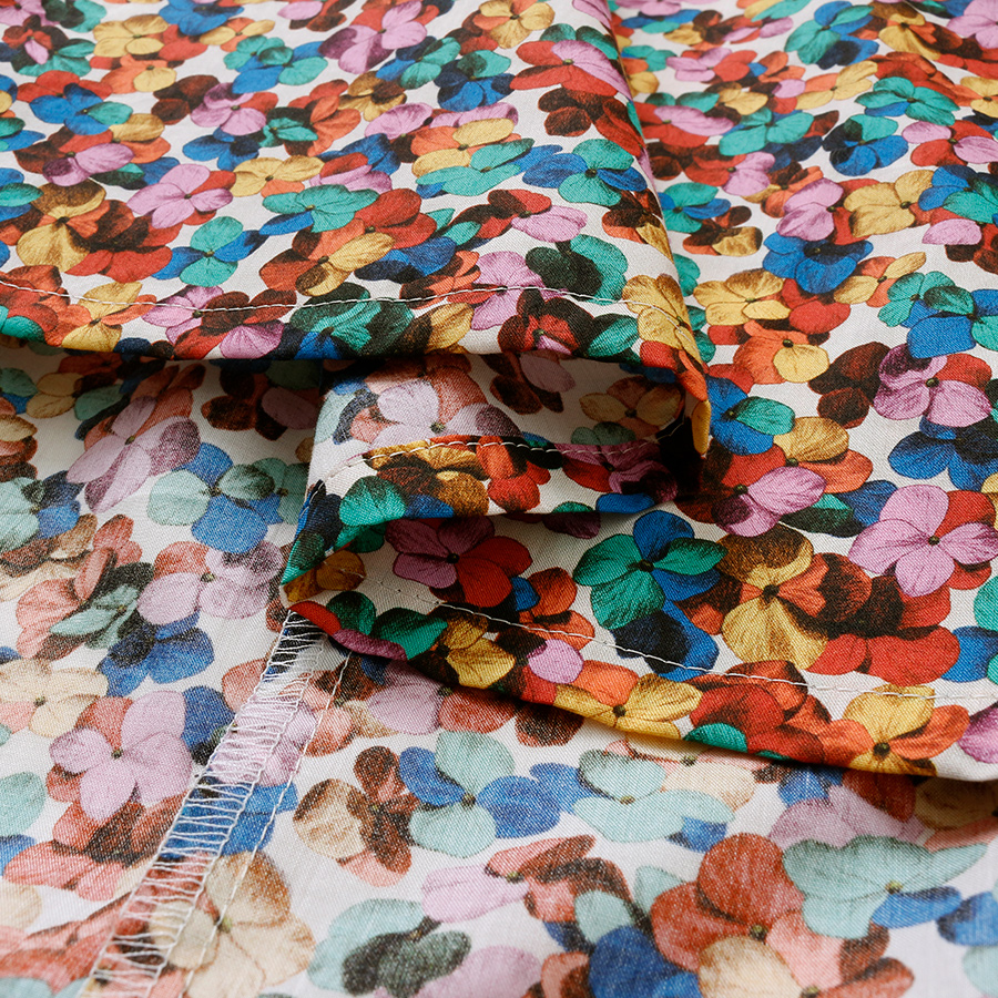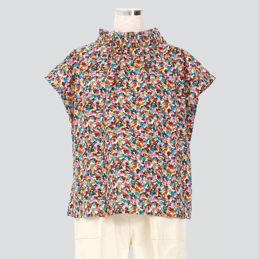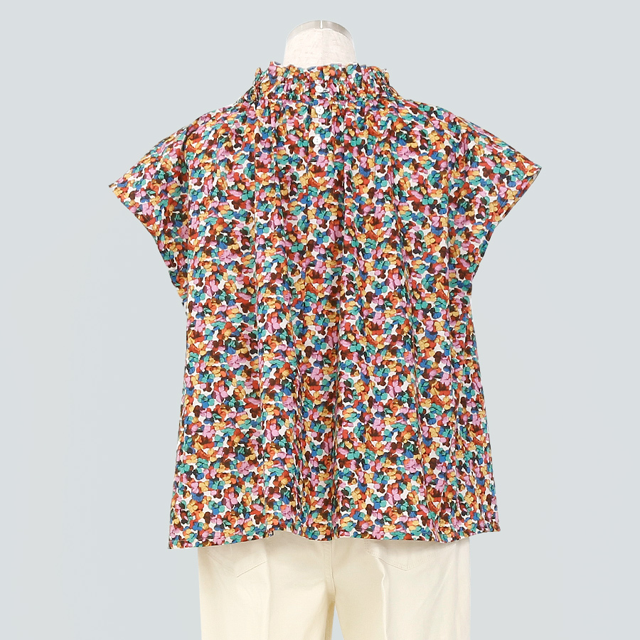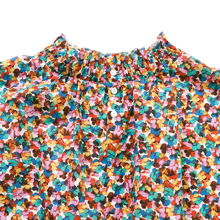 様々なカラーが取り込まれたアジサイのモチーフのブラウス。