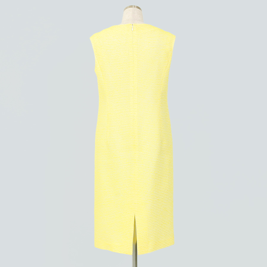 明るい印象を与えるレモンイエローのノースリーブワンピース。