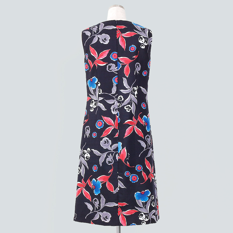 知的で高級感のあるネイビーベースに鮮やかなフラワープリントが映えるノースリーブワンピース。