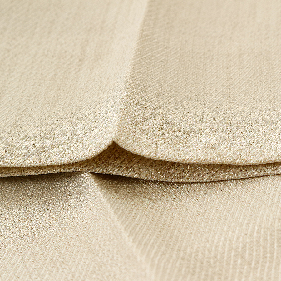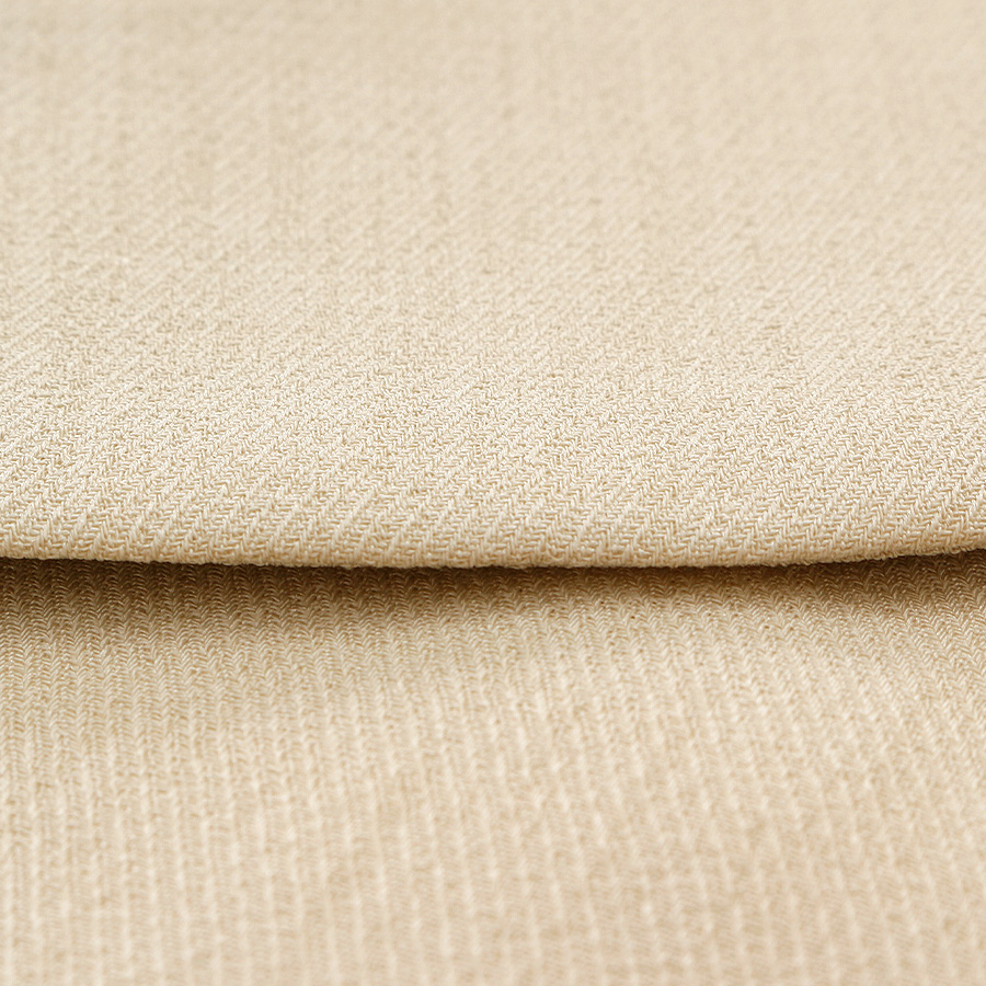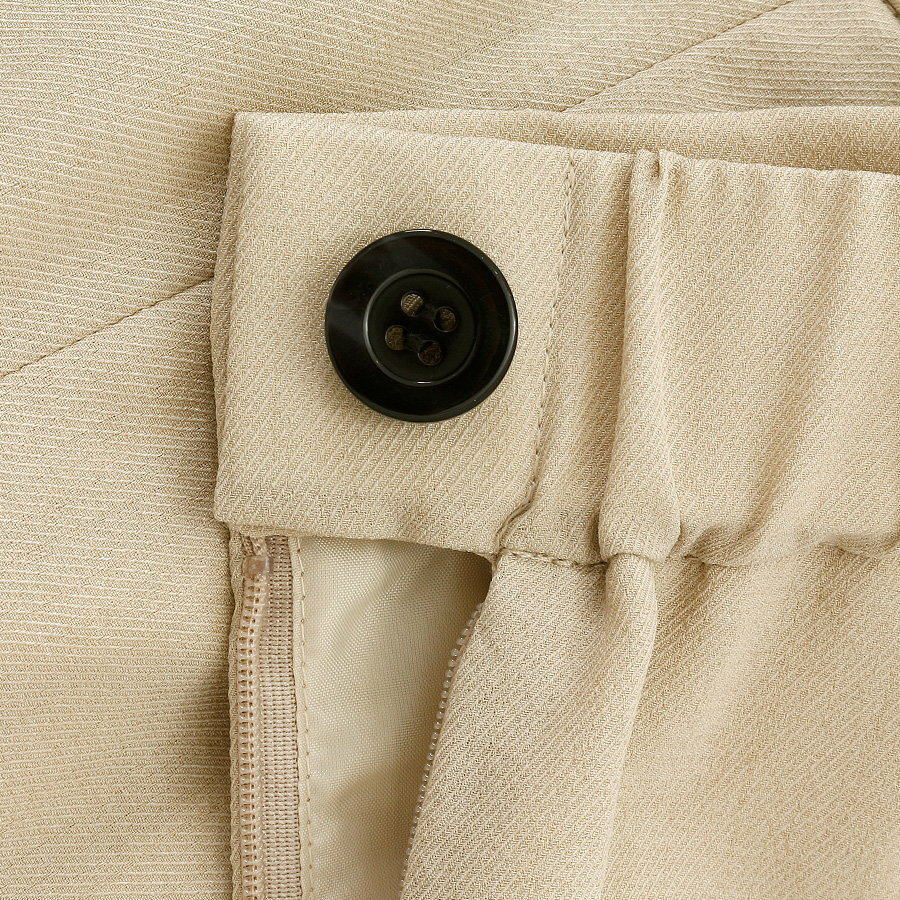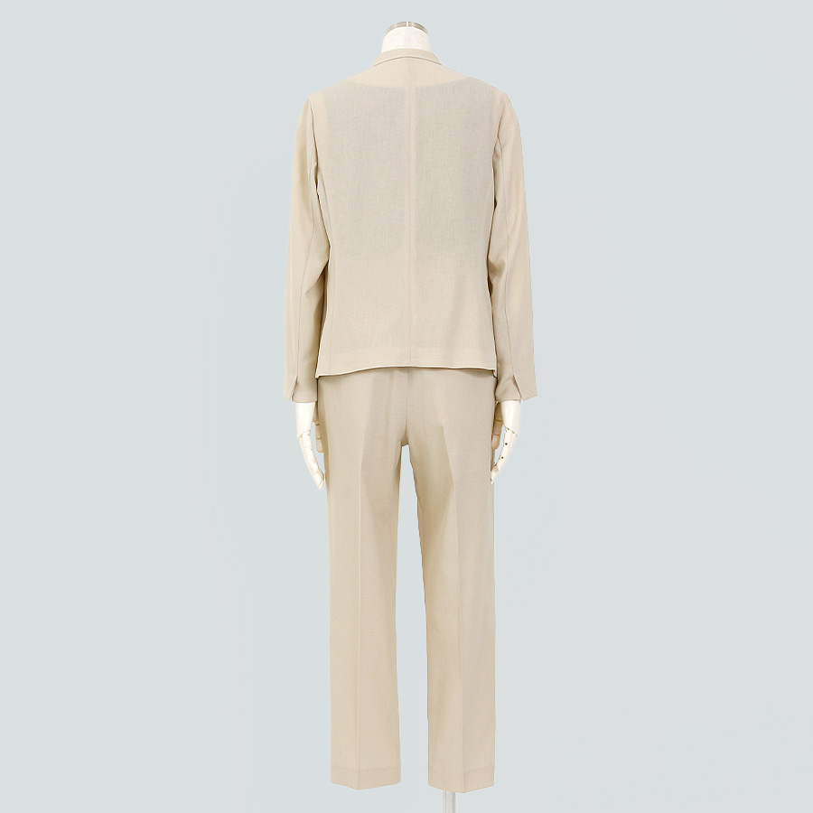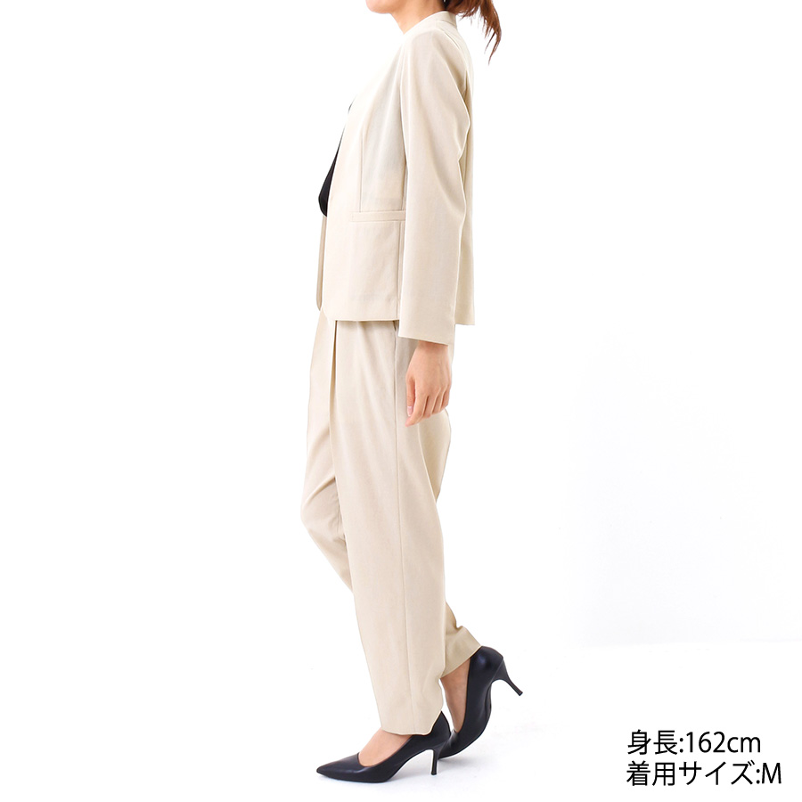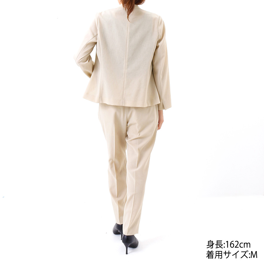 ノーカラーのジャケットが上品な印象を演出する、パンツスーツ。シャリ感のあるリネンライクな素材感で快適な着心地。