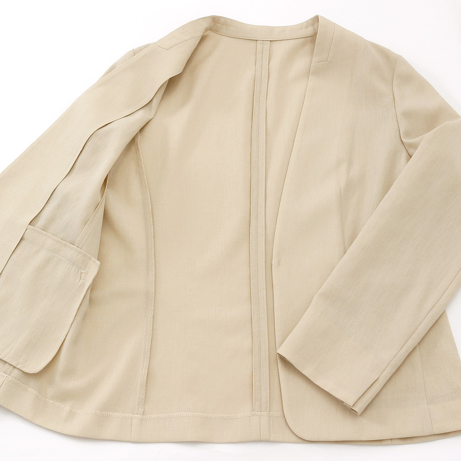 【ジャケット】フロントホックタイプのシンプルなノーカラージャケット。