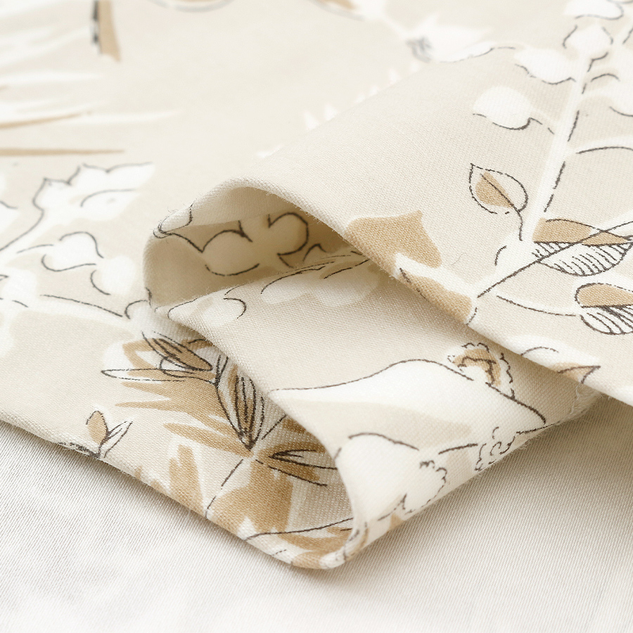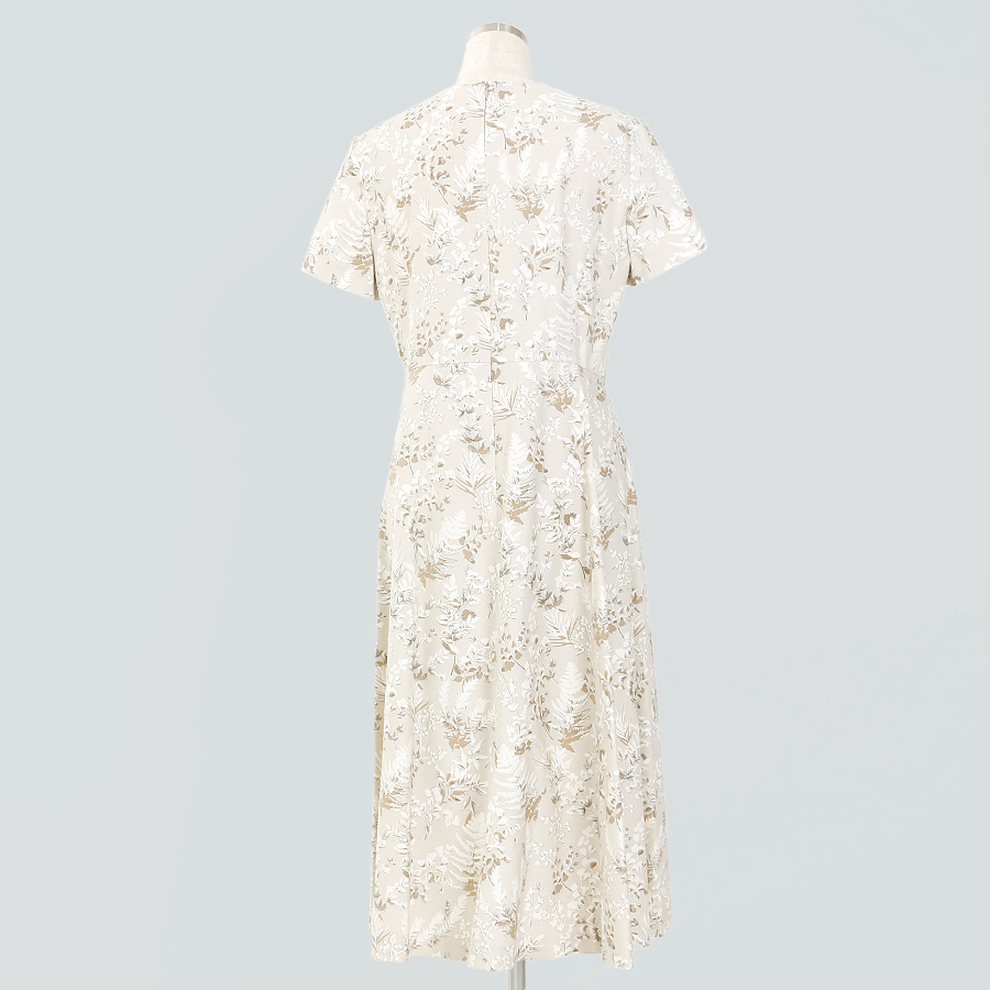 優しいベージュトーンに繊細なフラワープリントが映える上品ワンピース。