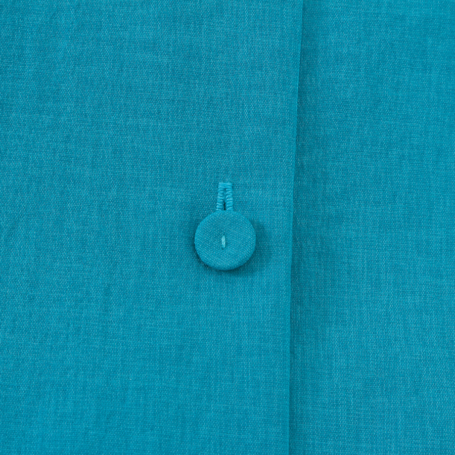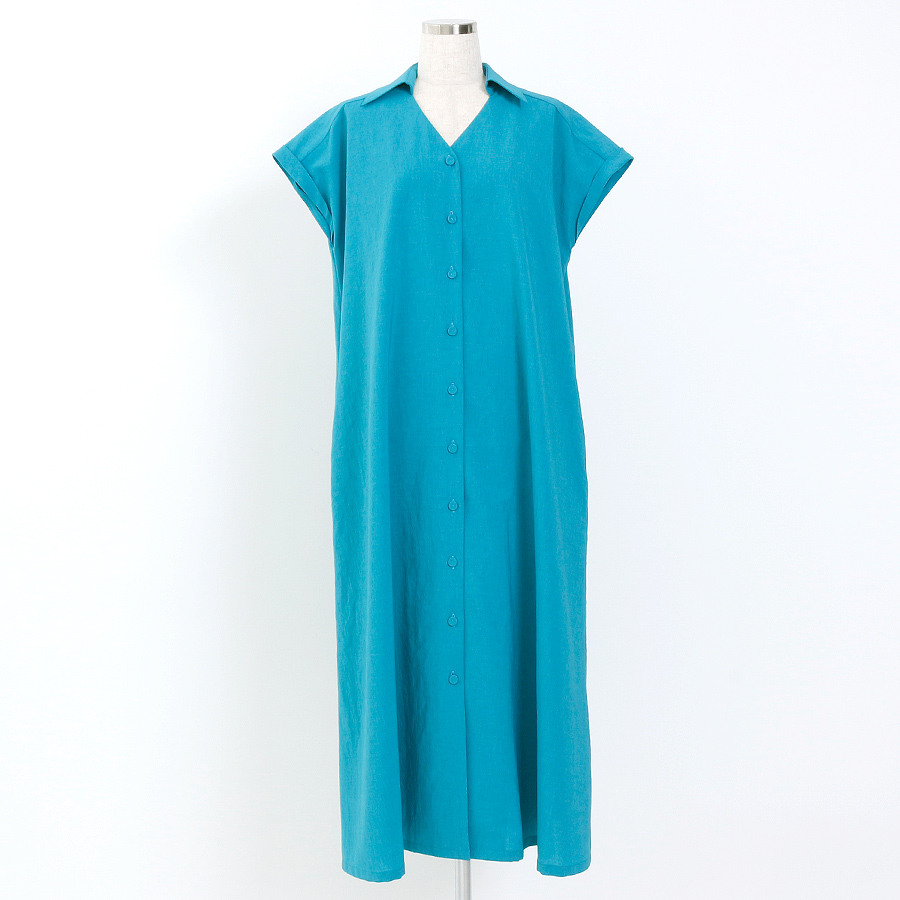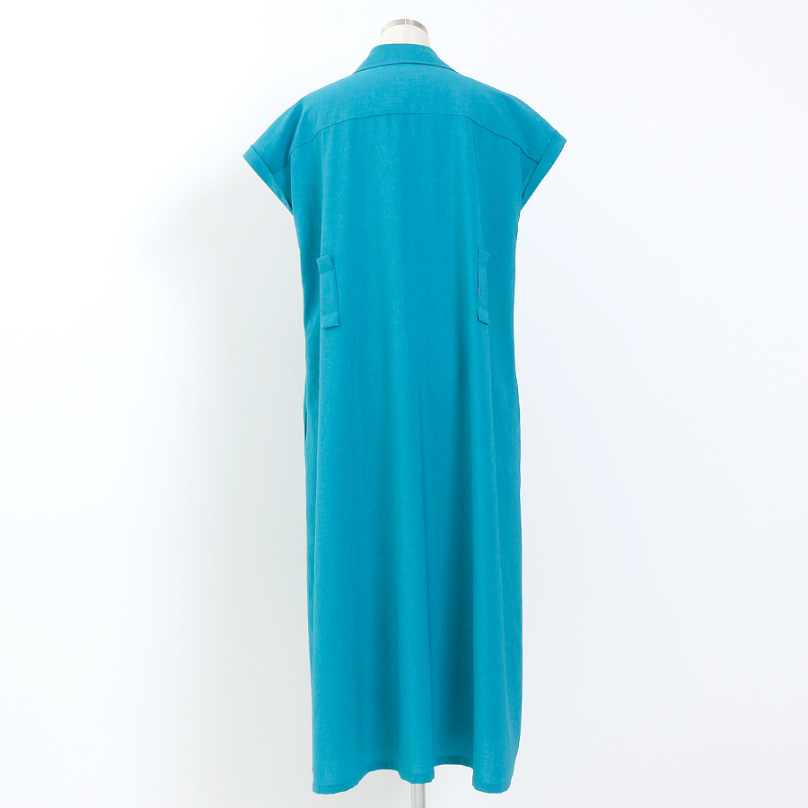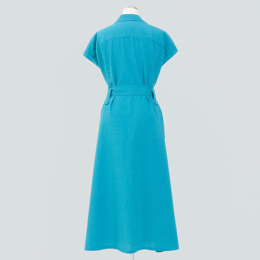 鮮やかなターコイズブルーが目を引くシャツワンピース。