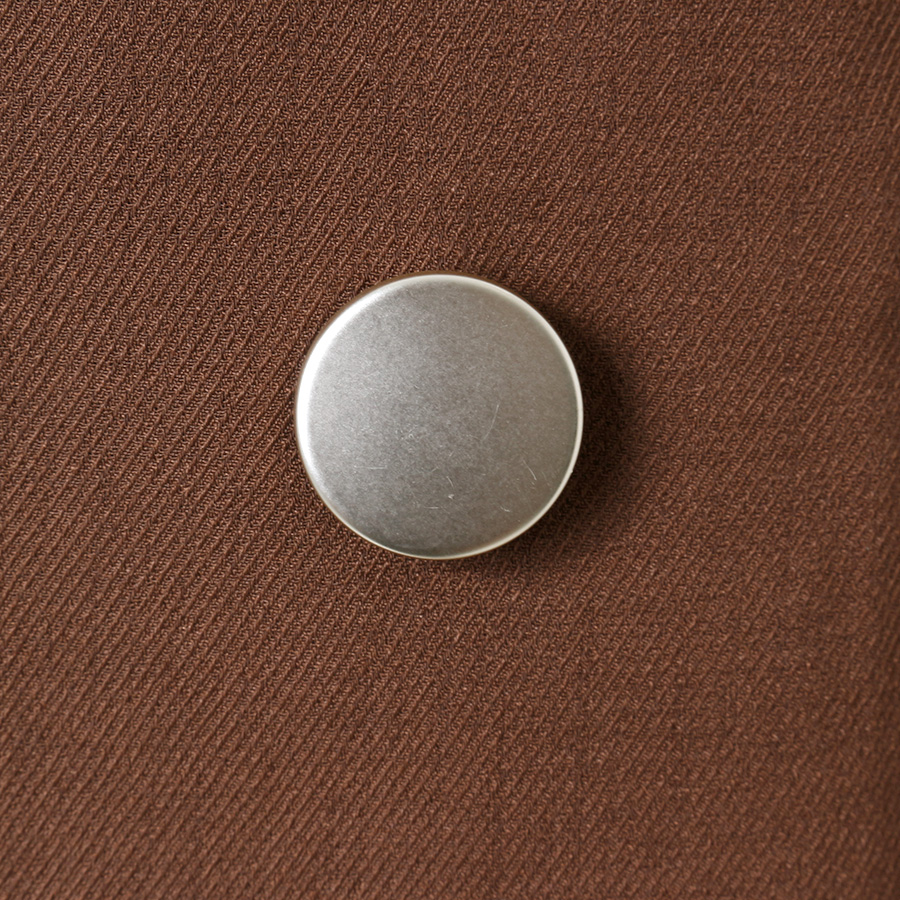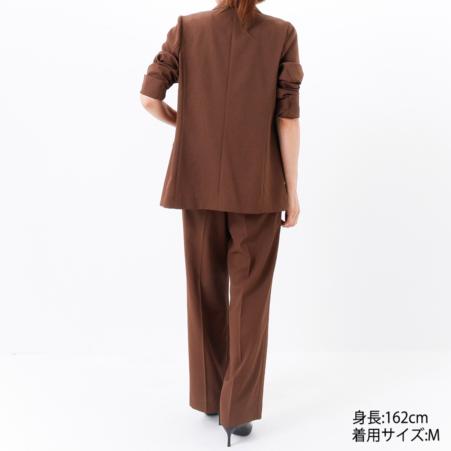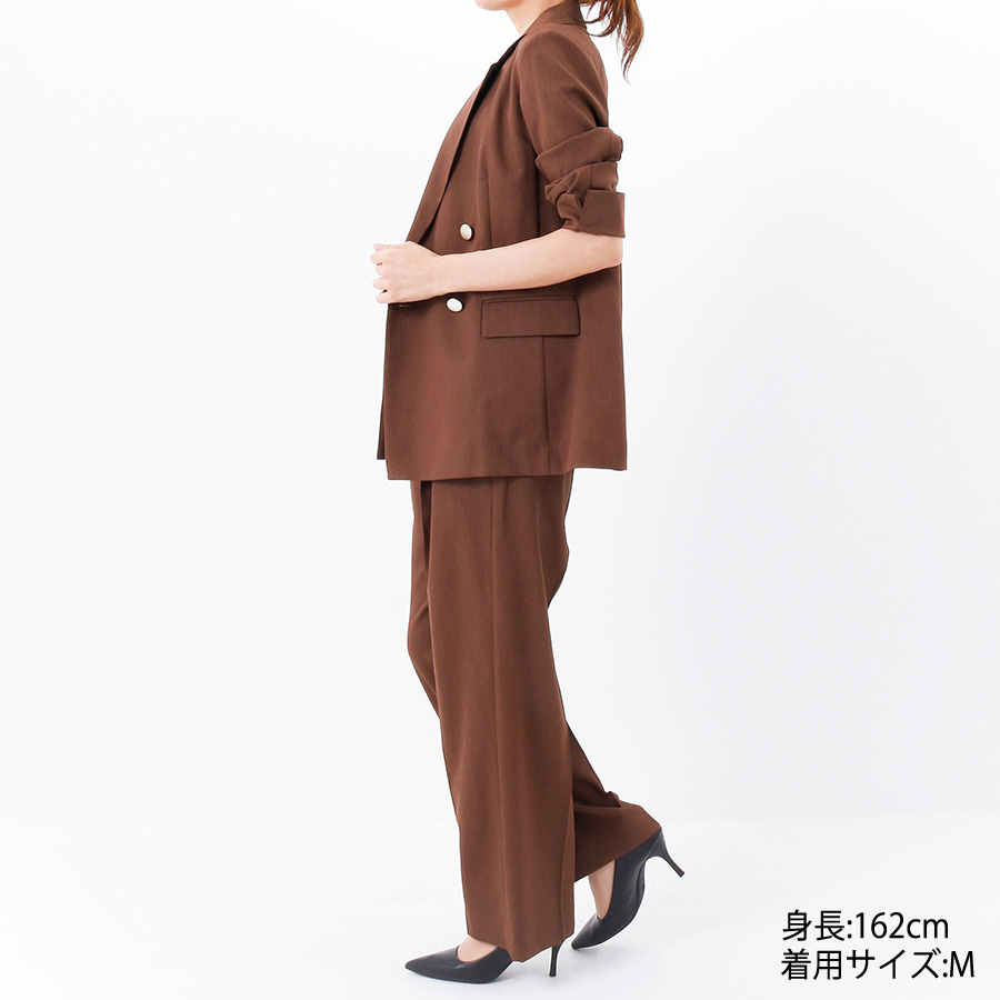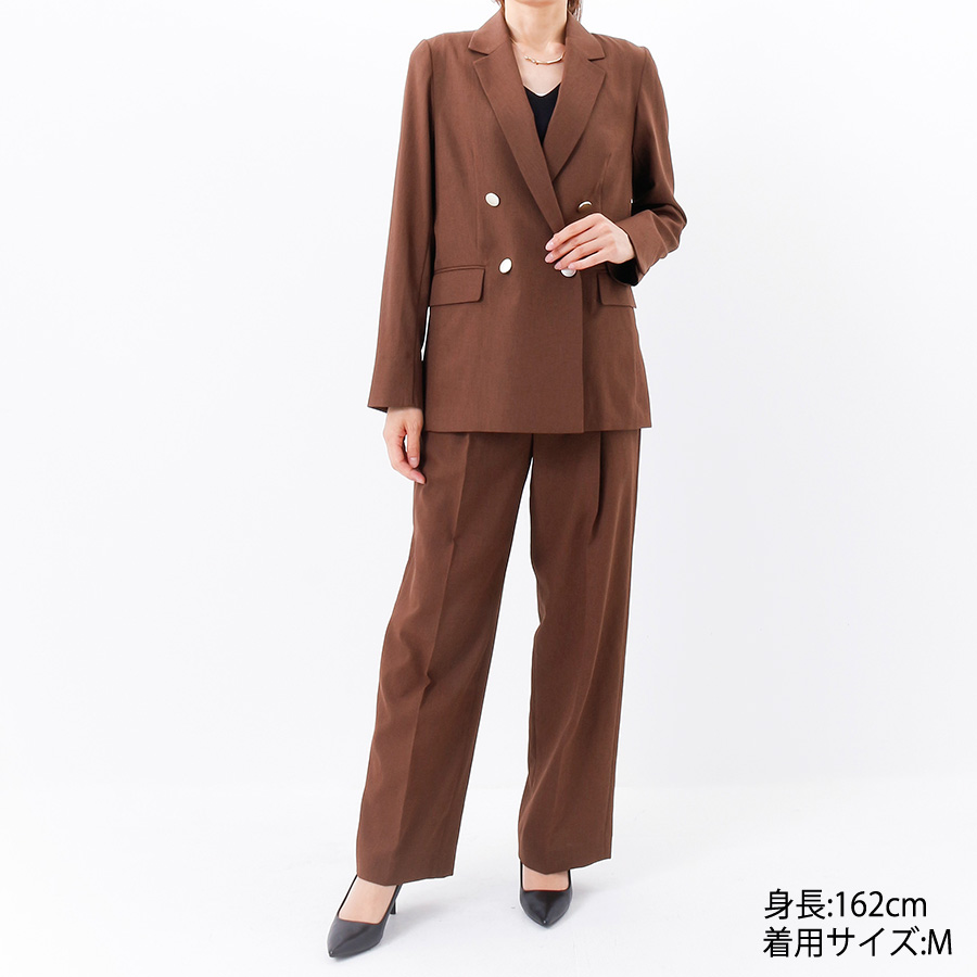 大きめのダブルボタンが目を惹く、クラシカルなデザインのパンツスーツ。トップ染めのような表情があり、シャリ感のあるリネンライクな素材感で快適な着心地。