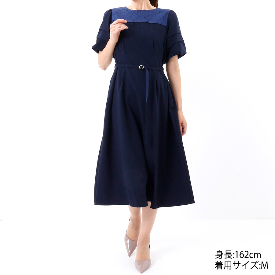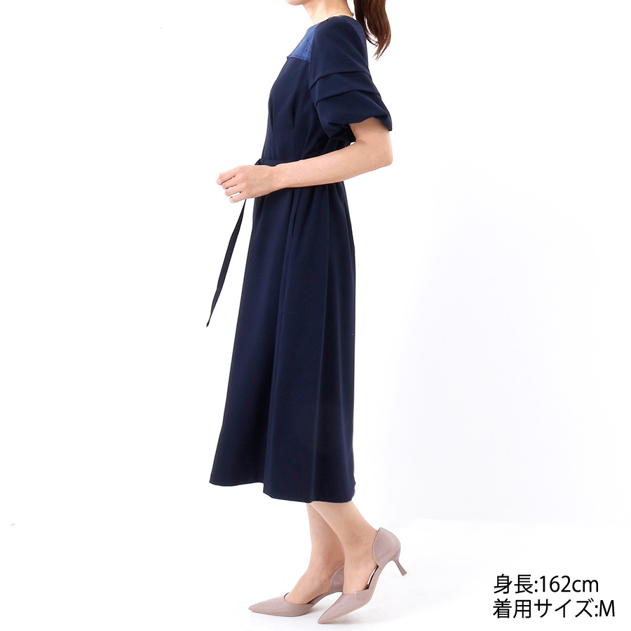 胸元のレース切り替えと、タックスリーブが華やかさをプラスするワンピース。