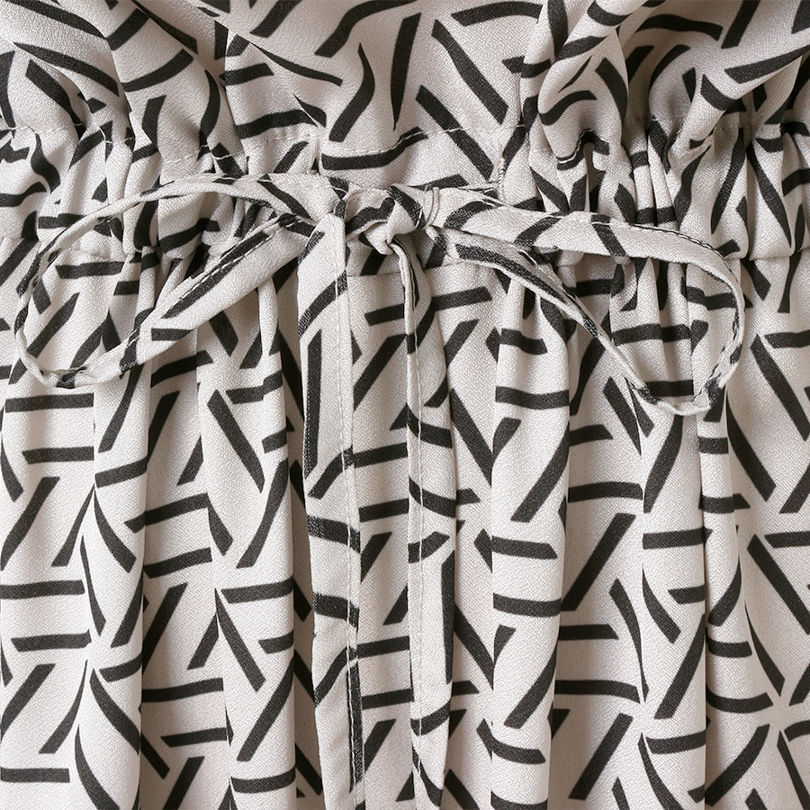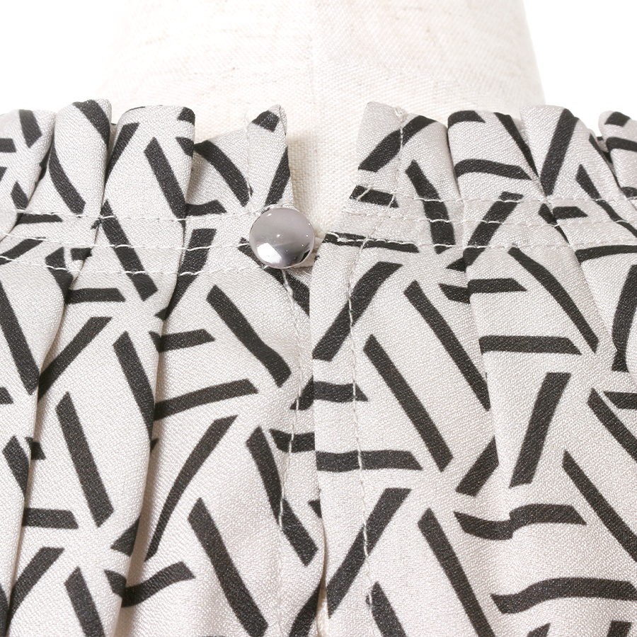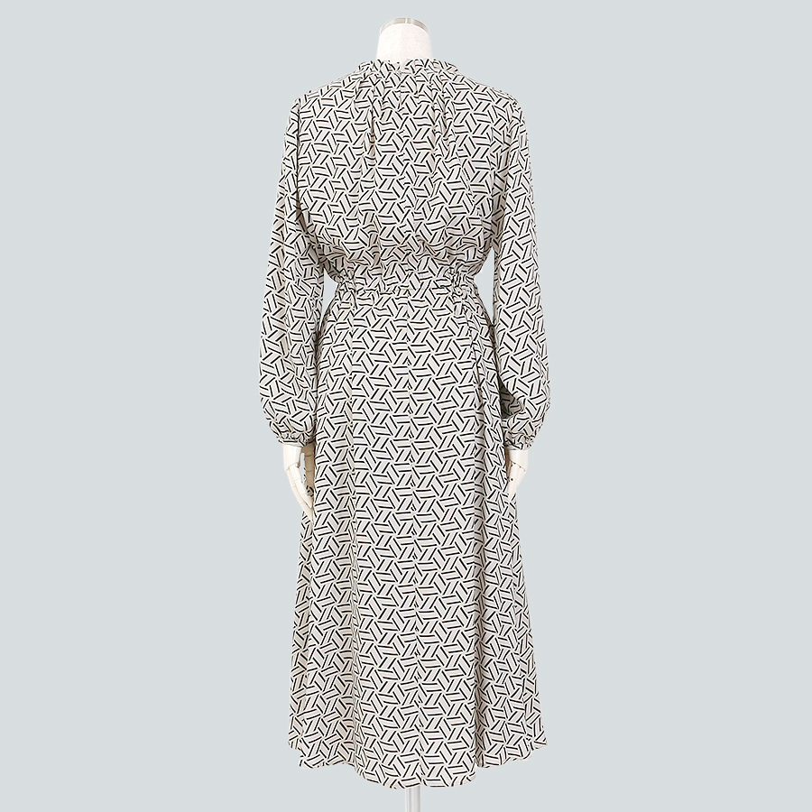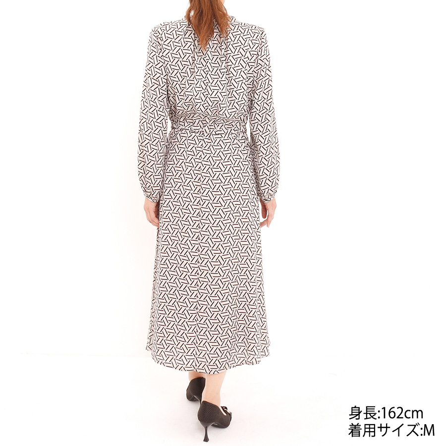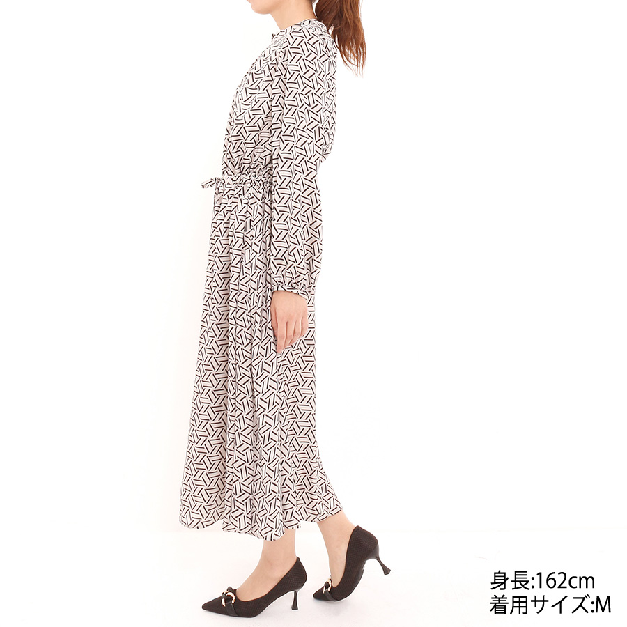 ★スタッフコメント★幾何柄が目を引くワンピース。衿元のタックデザインは上品で華やかな印象を与えてくれます。落ち感のあるしなやかなポリエステル素材で、歩くたびにしなやかに揺れるシルエットが魅力です。ウエストのリボンでスタイルアップも叶います。一枚で華やかさを演出できるので、ビジネスや女子会、セレモニーにもおすすめです。 ※色違い・サイズ違いはこちら(2486-00001)もご覧ください