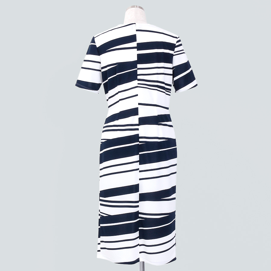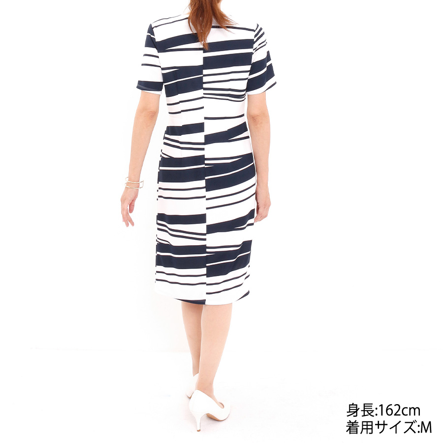 シャープな印象のアシンメトリーストライプ柄の細見えカシュクールワンピース。