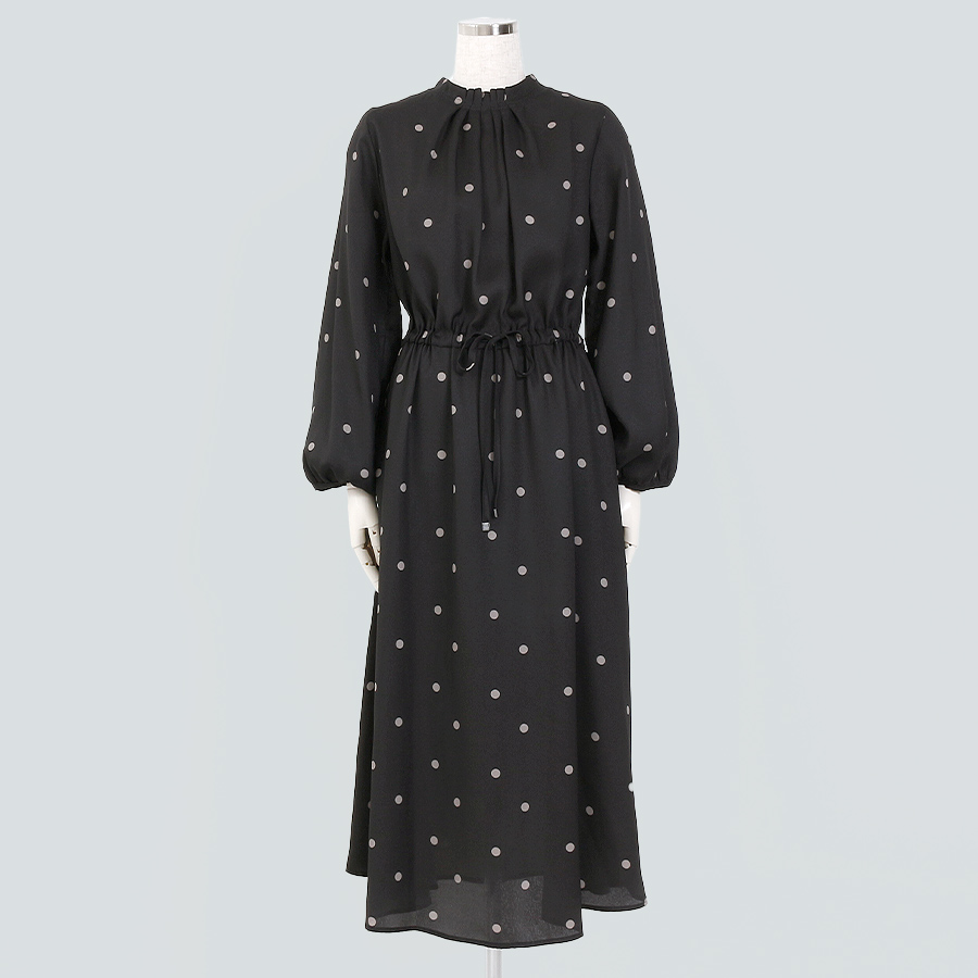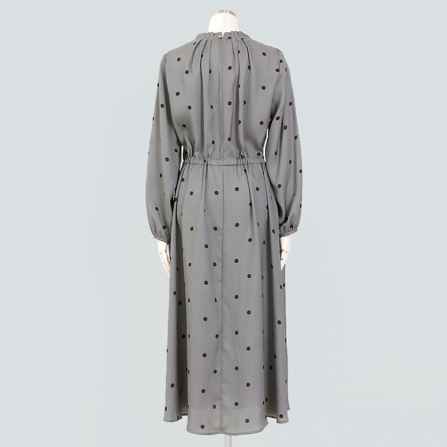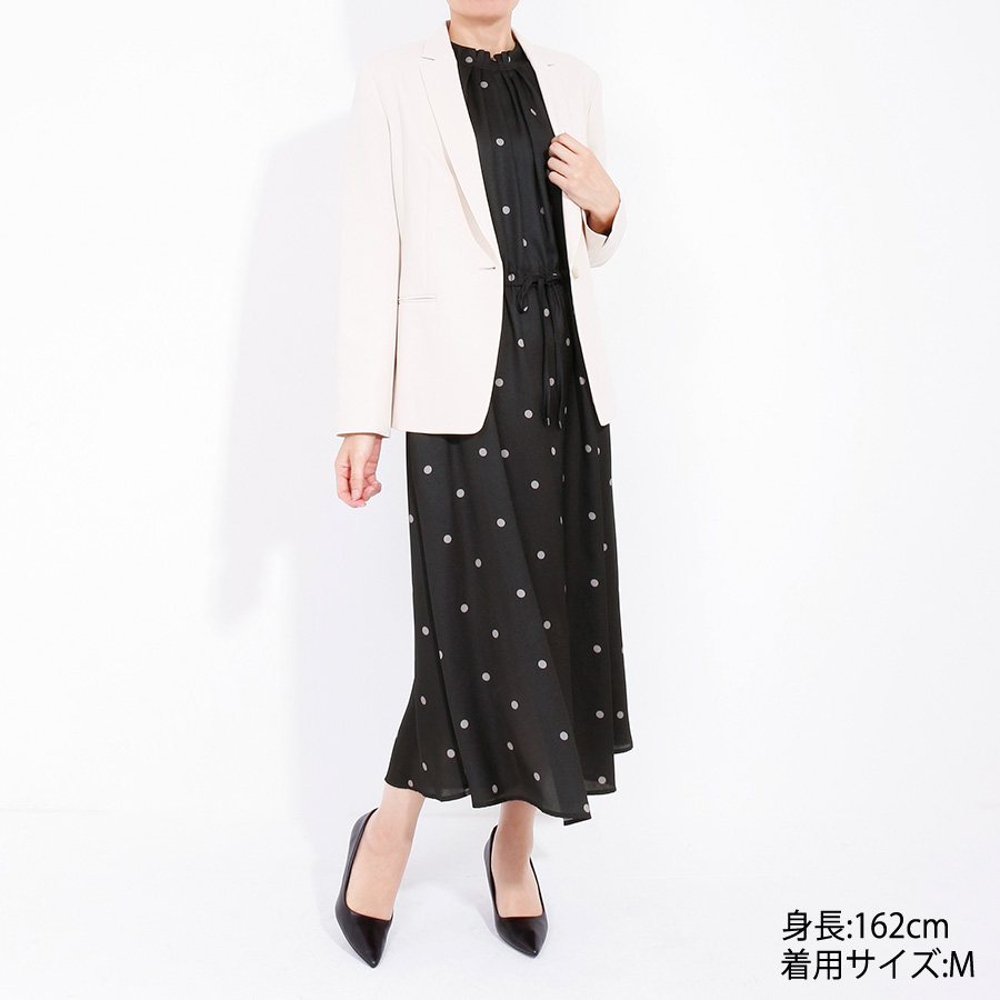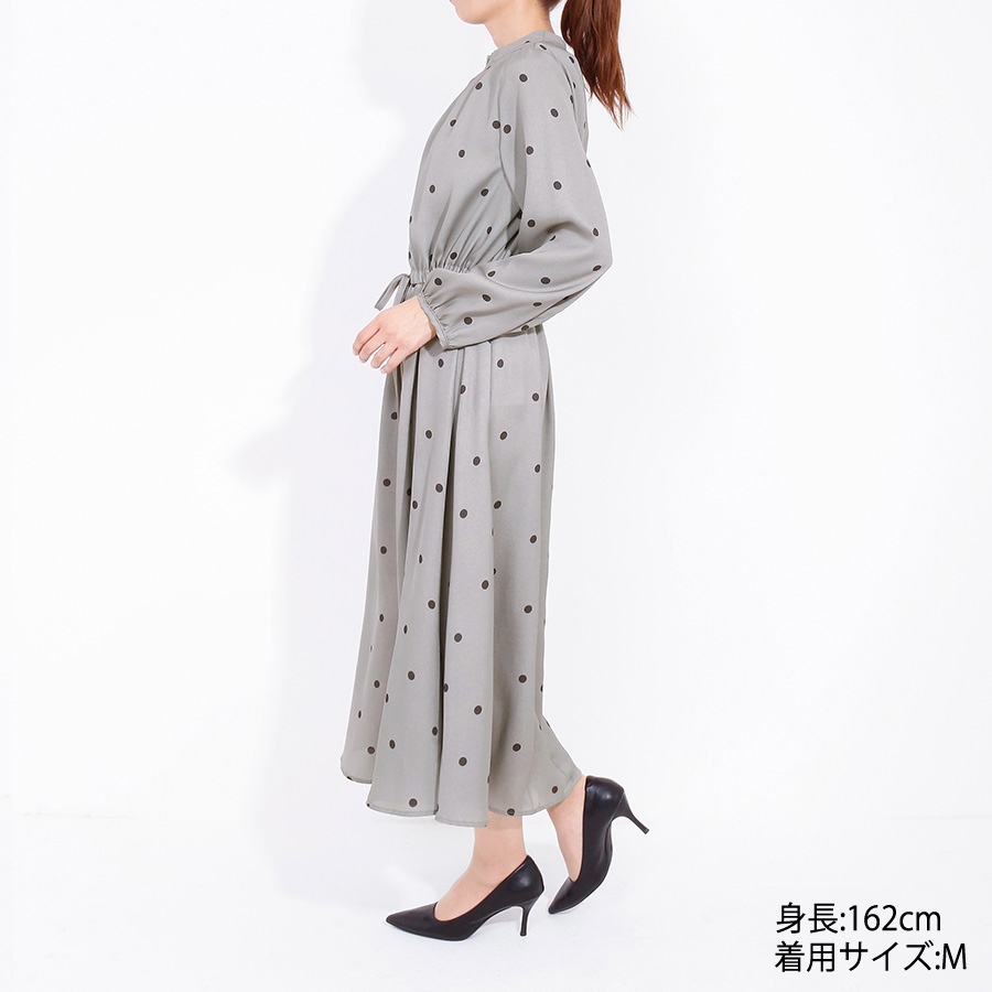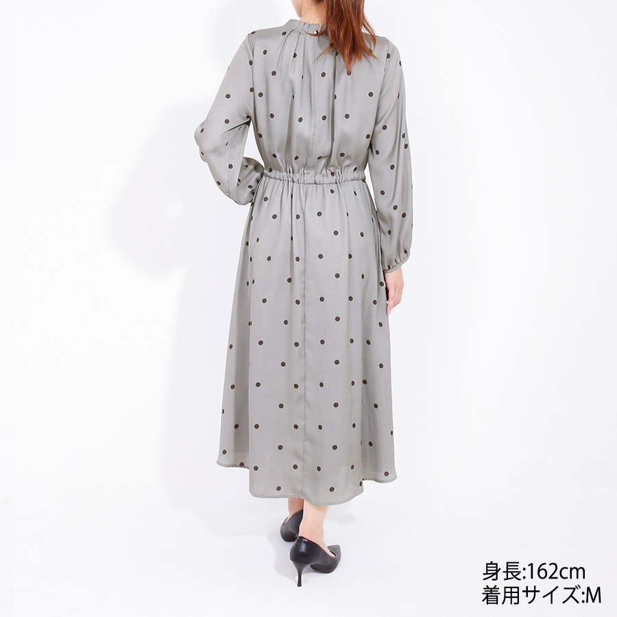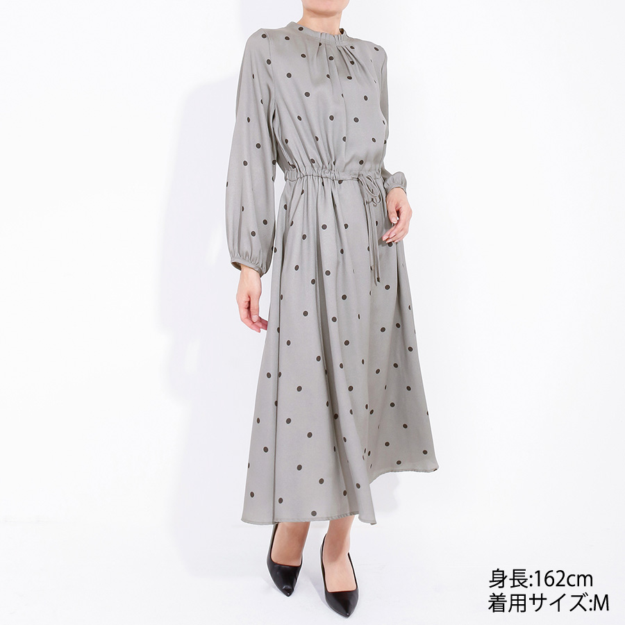 ★スタッフコメント★ドット柄が映えるワンピース。タックデザインのネックとウエストリボンで、やわらかな女性らしさを演出します。とろみのあるジョーゼット素材。長袖デザインで、季節の変わり目からロングシーズン活躍できるワンピースです。女子会やセレモニー、ジャケットコーデでオフィスシーンにもおすすめの一着です。 ※色違い・サイズ違いはこちら(2486-00002)もご覧ください