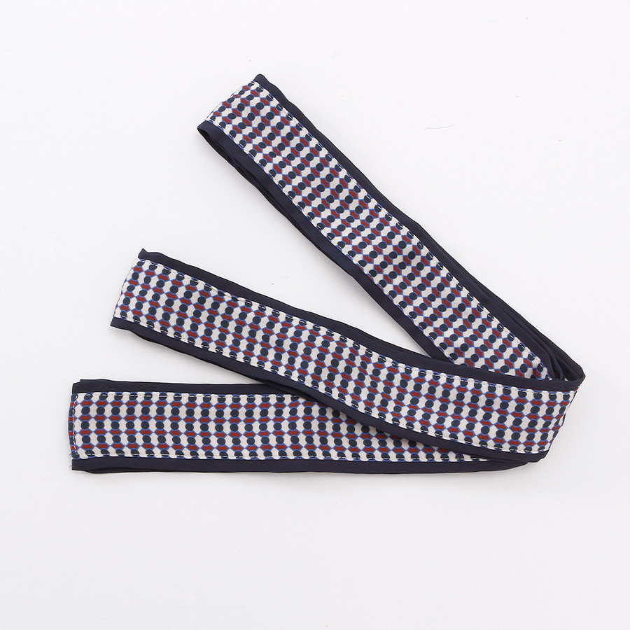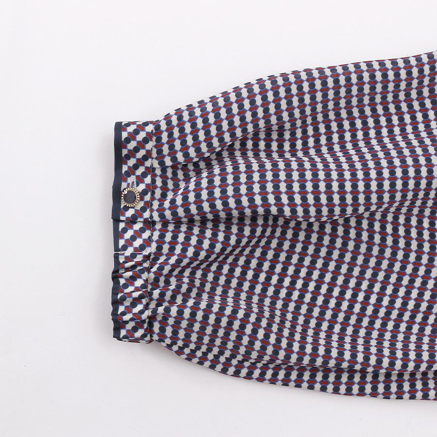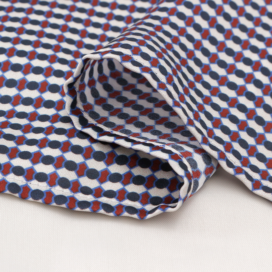 素材はジオメトリックなドットモチーフがプリントされたシルクのような光沢と発色性、しなやかな風合いが特徴です。
