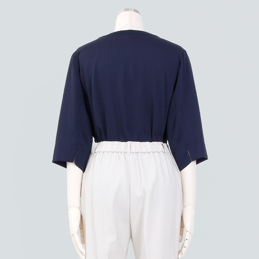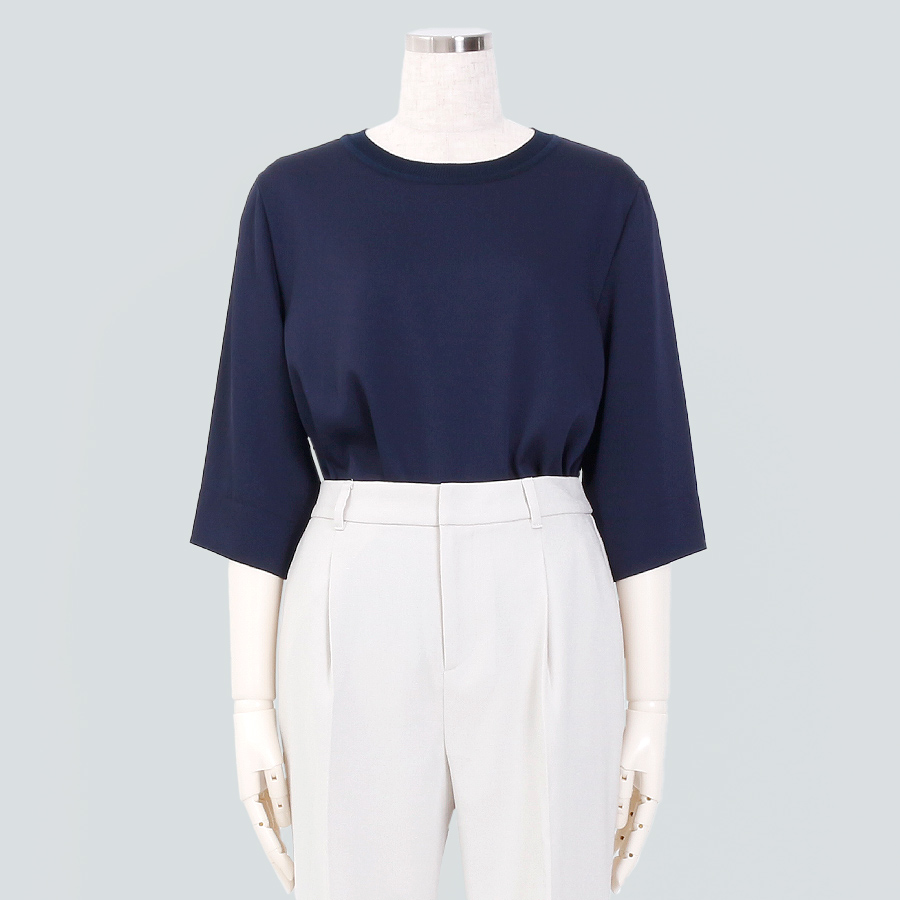 シンプルながら計算されたシルエットが魅力のネイビーブラウス。