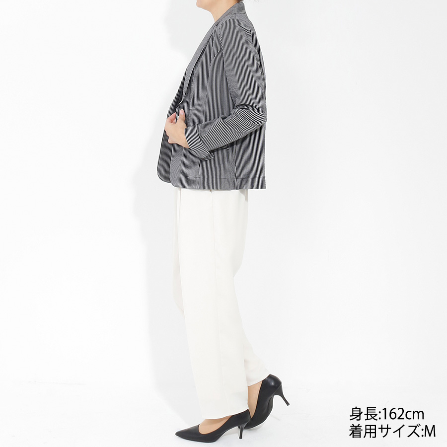 素材はサッカー素材なので、テーラードカラーできちんと見えするのにカーディガンのようにさらりと羽織やすく、オンオフあらゆるシーンで重宝する1着です。