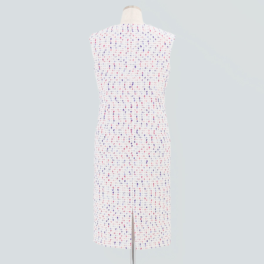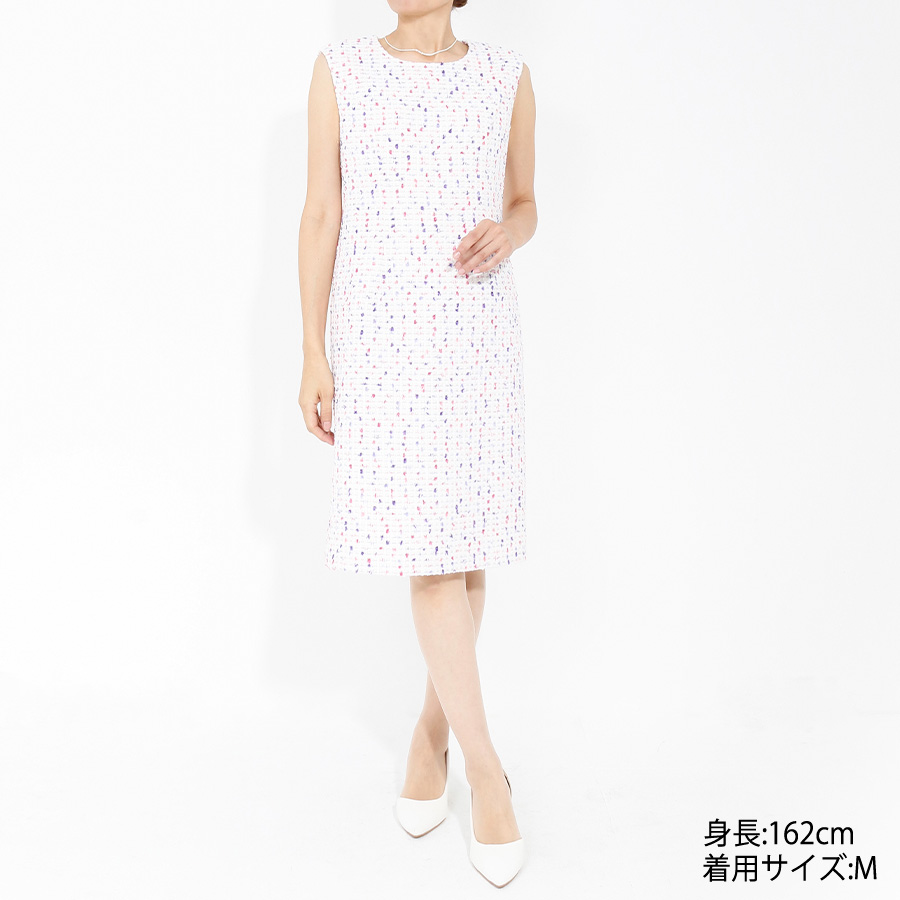 鮮やかなのに絶妙な、落ち着いたミックスカラーのファンシーツイードのIラインワンピース。