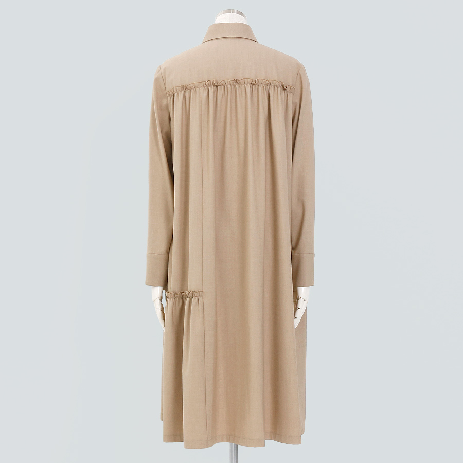 アシンメトリーに施されたギャザーが目を引くシャツワンピース。