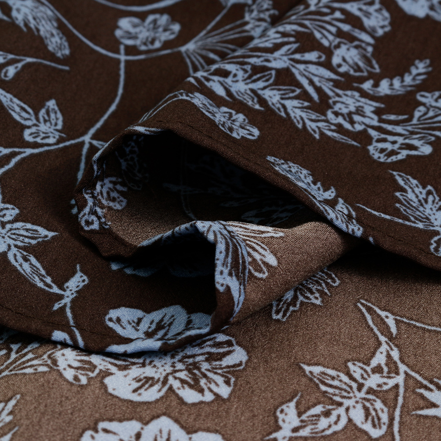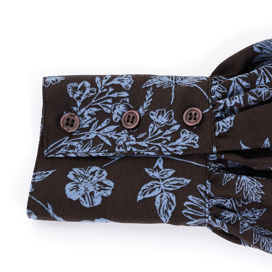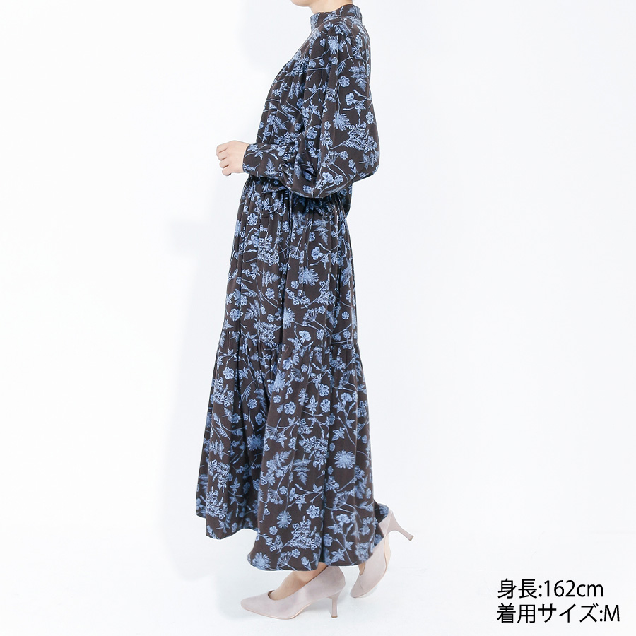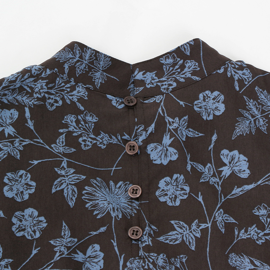 手書き風のフラワープリントが、華やかで、首元のハイネックデザインと、軽やかな素材とボリューム袖が女性らしさを演出してくでます。