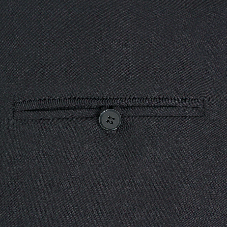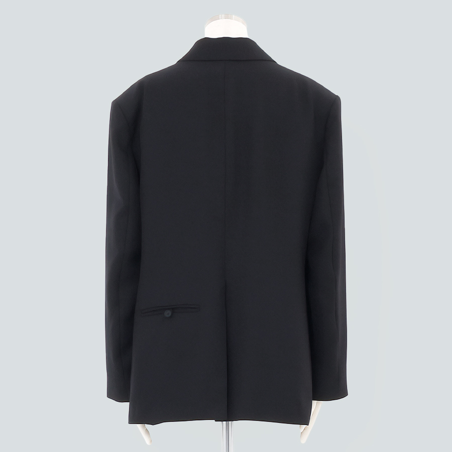 ボックスシルエットで広く見えがちな後ろ側にバランスよく玉縁ポケットが施されており、マンネリ化しないデザインに◎